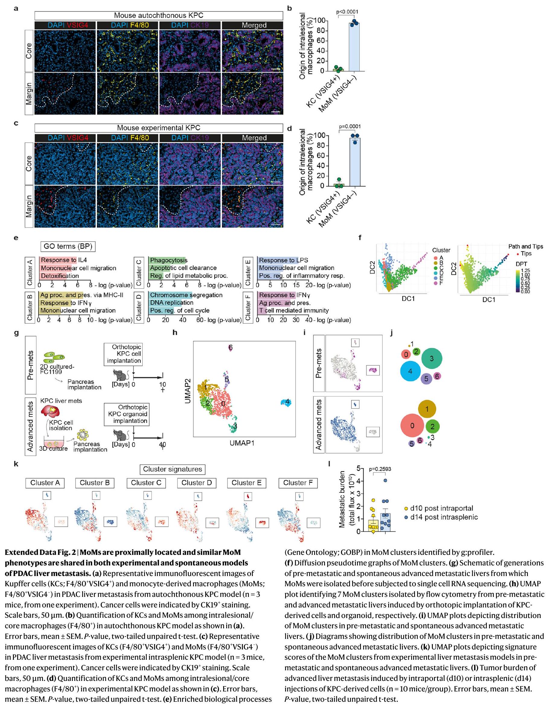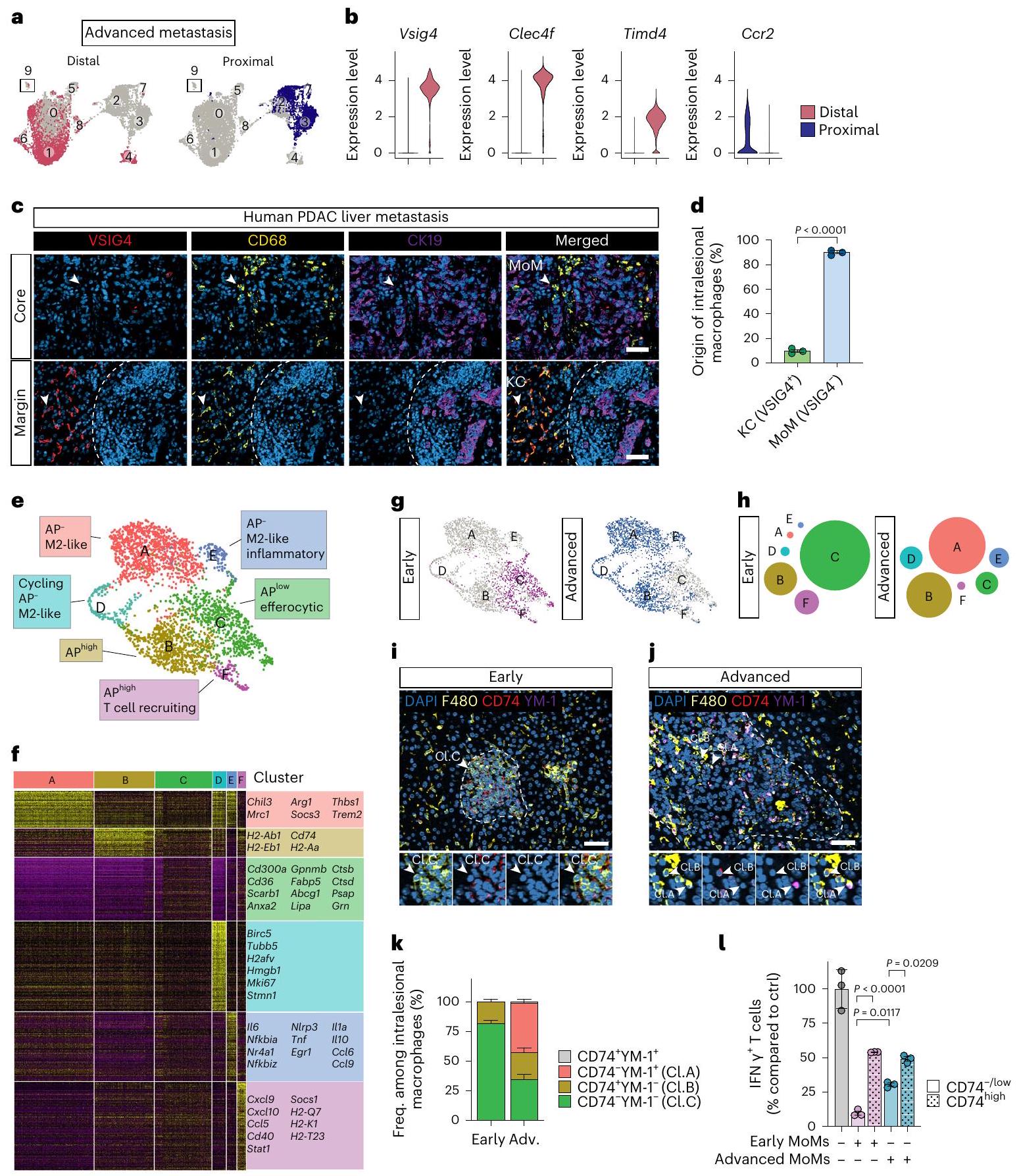 في المراحل المبكرة من الانبثاث، كانت مجموعة MoM مهيمنة من قبل المجموعة C، مع مساهمة طفيفة منالمجموعات الفرعية المرتبطة و كانت الآفات النقيليّة المتقدمة مهيمنة على العنقودومجموعة فرعية مشابهة لـ M2، تليها المجموعات E و D (الشكل 2g، h). كشفت تحليل الزمن الزائف عن مسار فينوتيبي يبدأ بالمجموعة F، تليها المجموعة C والمجموعة B، والتمايز النهائي إلى المجموعة A/D أو E خلال التقدم النقيلي (الشكل البياني الممتد 2f). في الكبد قبل النقيلي المعزول من الفئران التي تحتوي على أورام مزروعة في موضعها الأصلي، اكتشفناوعنقود-مثل تجمعات MoM (الشكل البياني الموسع. )، مما يظهر وجود تجمعات MoM المتعلمة على السرطان خلال تشكيل مكان ما قبل النقائل في الفئران الحاملة للأورام. كان تجمع شبيه بالتجمع A هو السائد في الكبد مع نقائل عفوية متقدمة تم عزلها من الفئران المزروعة بشكل موضعي مع عضيات أورام KPC (الشكل البياني الموسع. ). وقد تم دعم هذه النتائج من خلال صبغ المناعة لبروتين AP CD74 وعلامة M2 Chil3 المشفرة YM-1 في الأنسجة النقيليّة المبكرة والمتقدمة المعزولة من زراعة خلايا KPC بعد زراعة داخل الطحال. تم جمع الكبد في اليوم الخامس واليوم الرابع عشر (حمل ورمي قابل للمقارنة كما في اليوم العاشر بعد الزراعة داخل البوابة (الشكل البياني الممتد 21)). كما هو متوقع، كانت مستويات CD74 منخفضة أو غائبة تكون خلايا MoMs (العنقود C) الأكثر وفرة في الآفات النقيليّة المبكرة، بينما CD74 YM كانت MoMs (المجموعة A) تمثل أكثر مجموعة MoM شيوعًا في الآفات النقيليّة المتقدمة (الشكل 2i-k).