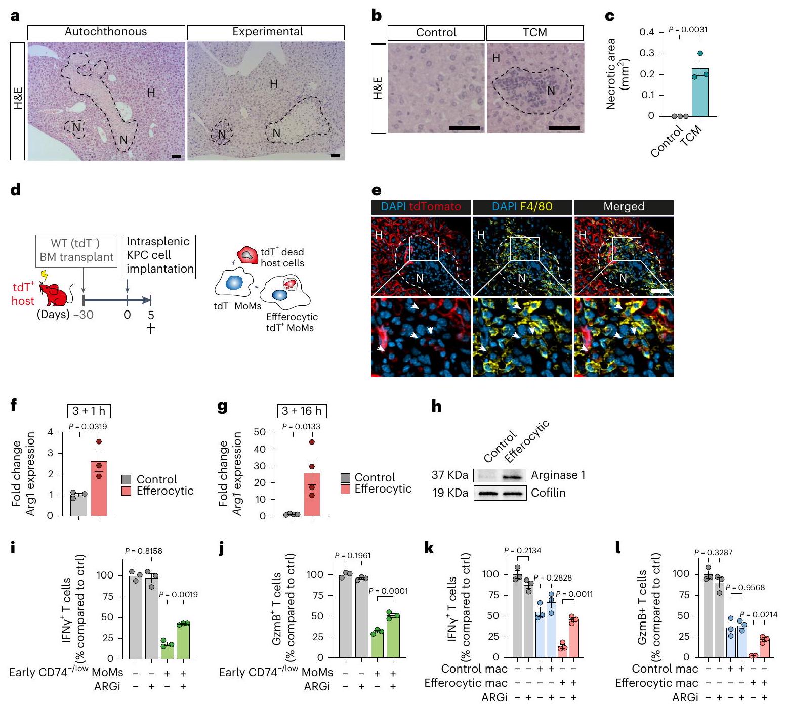 لاختبار الأهمية البيولوجية للأرجيناز 1، قمنا بتحفيزتم عزل خلايا T وزرعها مع خلايا MoMs المبكرة CD74-/low (الشكل 3i، j) أو البلعميات الفعالة (الشكل 3k، l) في وجود مثبط الأرجيناز 1، CB1158. مشابهة لخلايا MoMs المبكرة، أظهرت البلعميات الفعالة زيادة ملحوظة في النشاط المناعي المثبط، وعلاجها بمثبط الأرجيناز 1 CB1158 (ARGi) ألغى هذا التأثير (الشكل 3i-1). وهذا يشير إلى أن الأرجيناز 1 مسؤول عن النشاط المثبط لخلايا T من قبل البلعميات الفعالة. كما أن حجب نشاط الأرجيناز 1 قلل أيضًا من تأثير تثبيط خلايا T من قبل خلايا MoMs المتأخرة CD74-/low، مما يشير إلى أن الأرجيناز 1 يتوسط التأثيرات المناعية المثبطة في كل من خلايا MoMs المبكرة والمتأخرة CD74-/low (بيانات موسعة الشكل 3g، h). كما لاحظنا زيادة في موت الخلايا المبرمج للخلايا المنشطة.الخلايا عند زراعتها مع البلعميات الملتهمة في المختبر (الشكل 3i من البيانات الموسعة). باختصار، فإن انتشار سرطان البنكرياس في الكبد مصحوب بتلف الكبد وبلعمة الخلايا الميتة، مما يعزز تحويل البلعميات نحو نمط ظاهري مثبط للمناعة.