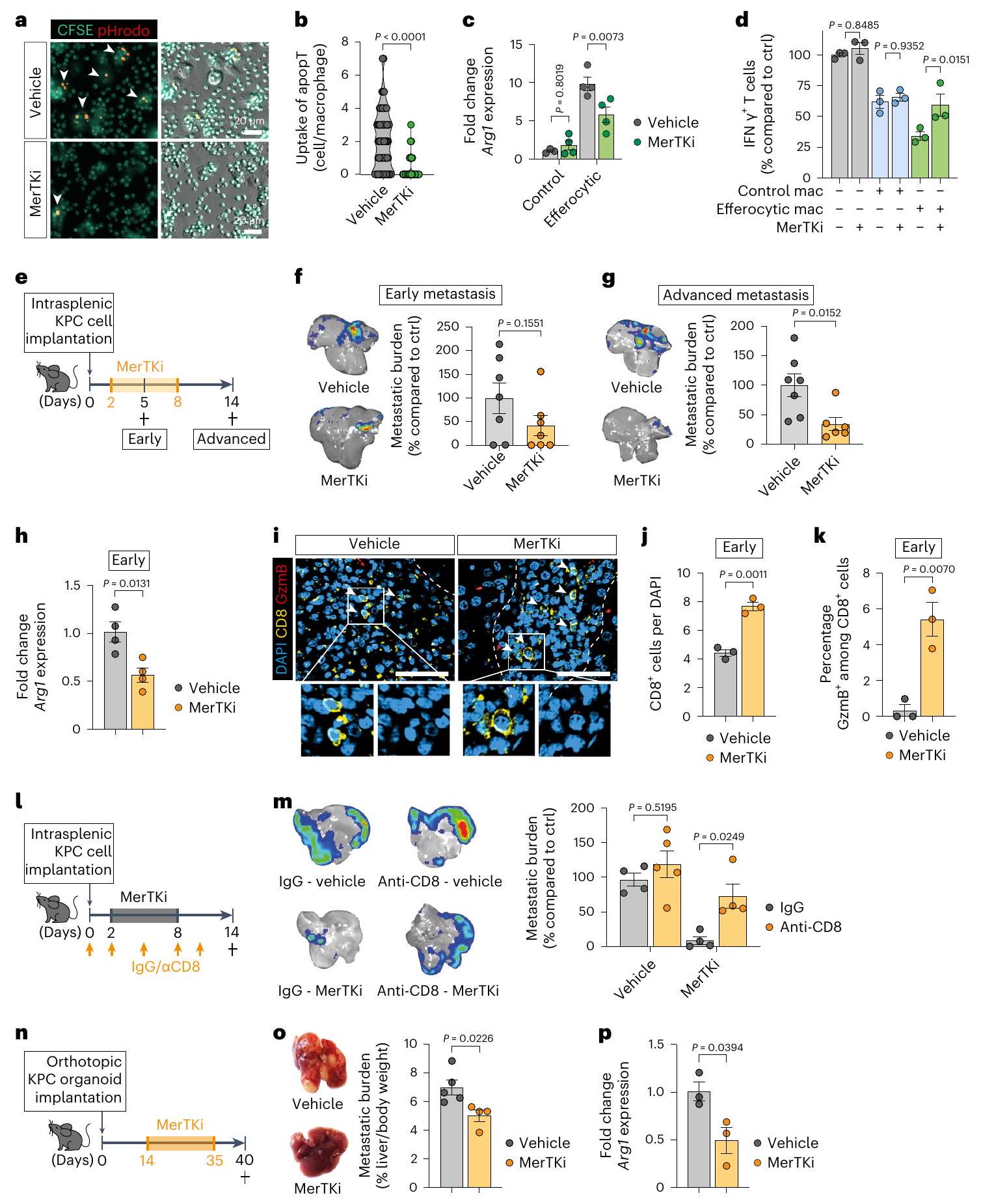 لتقييم الوظيفة البيولوجية لتحويل البلعميات الناتج عن الإيفيروسيتوز في نقائل الكبد الناتجة عن سرطان البنكرياس، قمنا بحظر الإيفيروسيتوز في المختبر باستخدام مثبط لبروتين كيناز التيروزين مير (MerTK)، UNC2250 (MerTKi). كما هو متوقع، قلل MerTKi من الإيفيروسيتوز في البلعميات التي تم زراعتها مع الخلايا التيموسية الميتة (الشكل 4أ، ب) وأزال تحفيز تعبير Arg1 في البلعميات (الشكل 4ج والشكل الإضافي 4أ). علاوة على ذلك، قلل MerTKi من نشاط قمع خلايا T بواسطة البلعميات الإيفيروسيتوزية (الشكل 4د والشكل الإضافي 4ب).