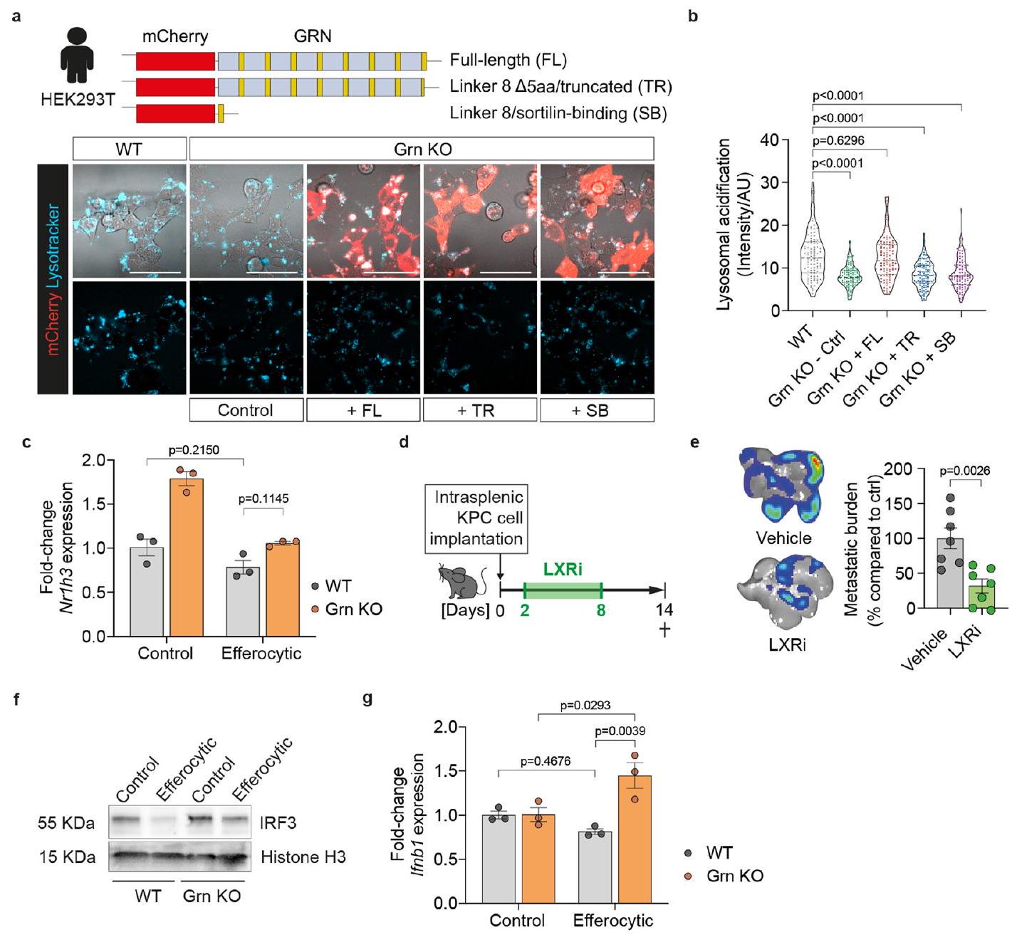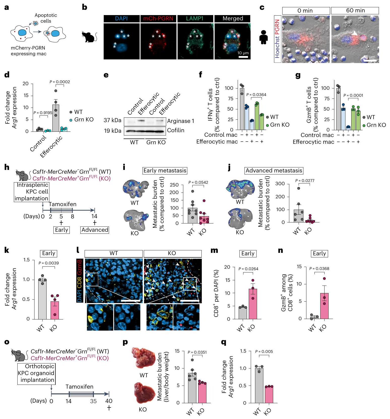 حجب إزالة الخلايا النخرية يؤدي إلى زيادة تلف الأنسجة. قد يكون التدخل في مراحل ما بعد الابتلاع من الإيفيروسيتوز استراتيجية أفضل لقمع استقطاب البلعميات خلال انتشار سرطان البنكرياس إلى الكبد. لتحديد هدف محدد للبلعميات، قمنا بتحليل الجينات الليزوزومية المرتفعة في مجموعة موM المبكرة 2 من تحليل تسلسل RNA أحادي الخلية لدينا. من بين الجينات المرتفعة كان بروجرانولين (Grn) (الشكل التمديدي 6a)، وهو بروتين سابق موجه إلى الحجرة الليزوزومية، حيث يُعتقد أن القطع المقطوعة بروتينيًا المعروفة باسم الجرانولينات ضرورية لوظيفة الليزوزوم في البلعميات.لقد أظهرنا أن البلعميات هي مصدر رئيسي للبروجرانولين في نقائل سرطان البنكرياس إلى الكبد.وأن نقص البروجرانولين مرتبط بأنشطة بلعومية معيبة استجابةً للعدوى البكتيريةافترضنا أن البروجرانولين قد يلعب دورًا حاسمًا في عملية الإيفيروسيتوز التي تتوسطها البلعميات. ووفقًا لفرضيتنا، وجدنا أن الإيفيروسيتوز يحفز التعبير عن Grn في البلعميات البشرية والفأرية الأولية (الشكل التمديدي 6ب، ج) وأن البروجرانولين يتوضع في الحجرة الليزوزومية في هذه الخلايا أثناء الإيفيروسيتوز (الشكل 5أ-ج). بالإضافة إلى ذلك، فإن زيادة التعبير عن Arg1 الناتجة عن الإيفيروسيتوز (الشكل 5د، هـ) وقمع CD8تم تقليل وظيفة خلايا T بشكل كبير في البلعميات التي تفتقر إلى البروجرانولين (الطفرة الجينية Grn (KO)) (الشكل 5f، g).