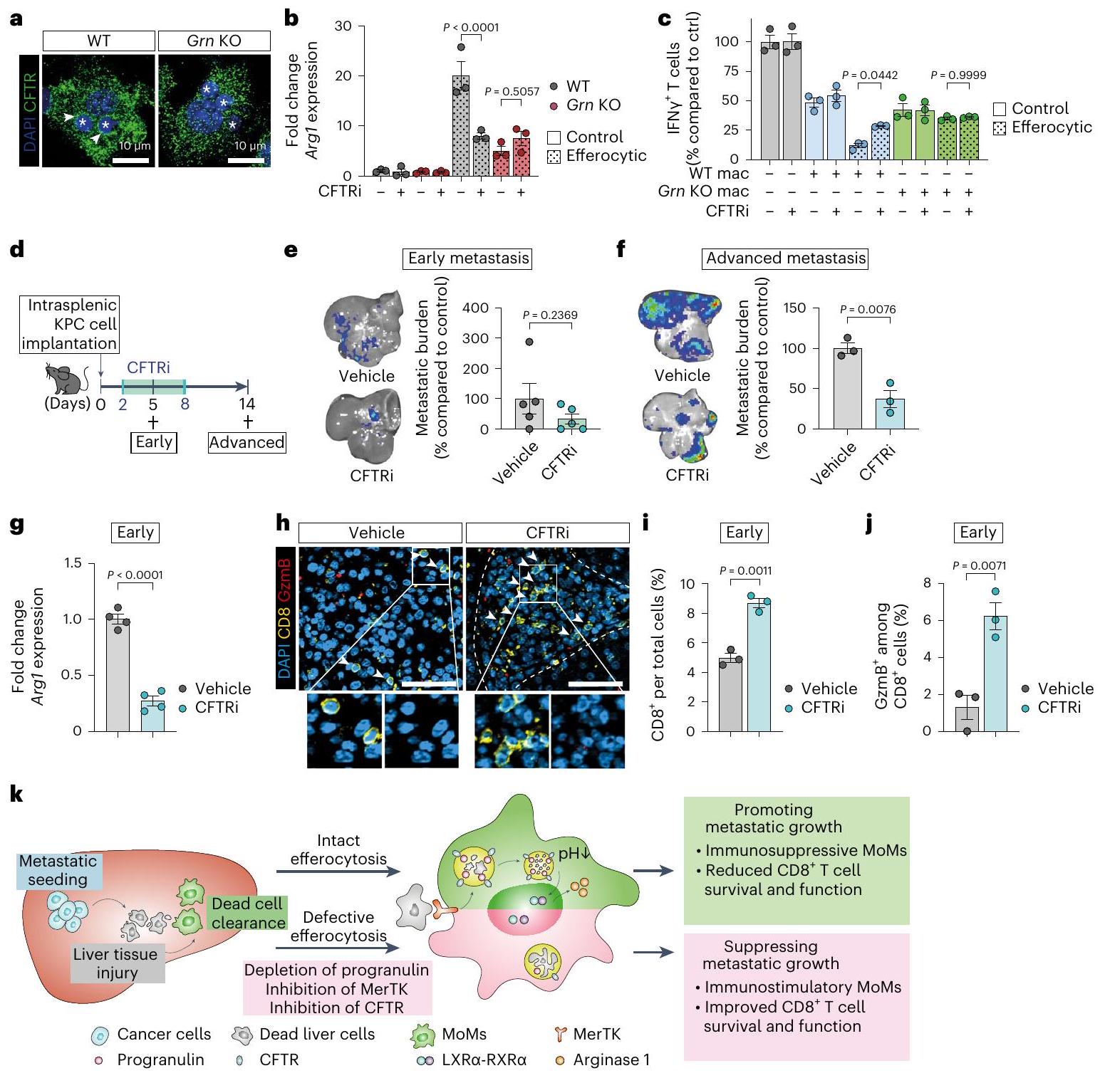 البروجرانولين هو بروتين ليسوزومي منظم للمناعةلقد أظهرنا أن البروجرانولين له تأثيرات مؤيدة للورم وينشط الخلايا الليفية في نقائل الكبد المتقدمة لسرطان البنكرياس.في هذه الدراسة، كان استنفاد البروجرانولين في البلعميات الملتهمة كافياً لمنع زيادة تعبير Arg1 واستعادة تنشيط خلايا T. من الناحية الآلية، ينظم البروجرانولين حموضة الليزوزومات، عبر CFTR، وهو ما يتطلب لمعالجة مثلى لشحنة الخلايا الميتة والـ LXR اللاحق.-تنظيم مفرط لـ Arg1 بواسطة الوسائط (الشكل 7م). وبالتالي، CFTR أو LXRتؤدي المثبطات أيضًا إلى تحويل البلعميات وتحفيز خلايا T. ستكون هناك حاجة إلى مزيد من الدراسات لاستكشاف ما إذا كان استهداف الإيفيروسيتوز (MerTK) أو التحلل الليزوزومي (بروجرانولين/CFTR) أو LXR في المراحل اللاحقة.التفعيل سيكون مفيدًا، بالاشتراك مع العلاج الكيميائي السام للكبد أو العلاجات المناعية المعتمدة على نقاط التفتيش، لاستغلال الاستجابات المناعية المضادة للأورام المتزايدة.