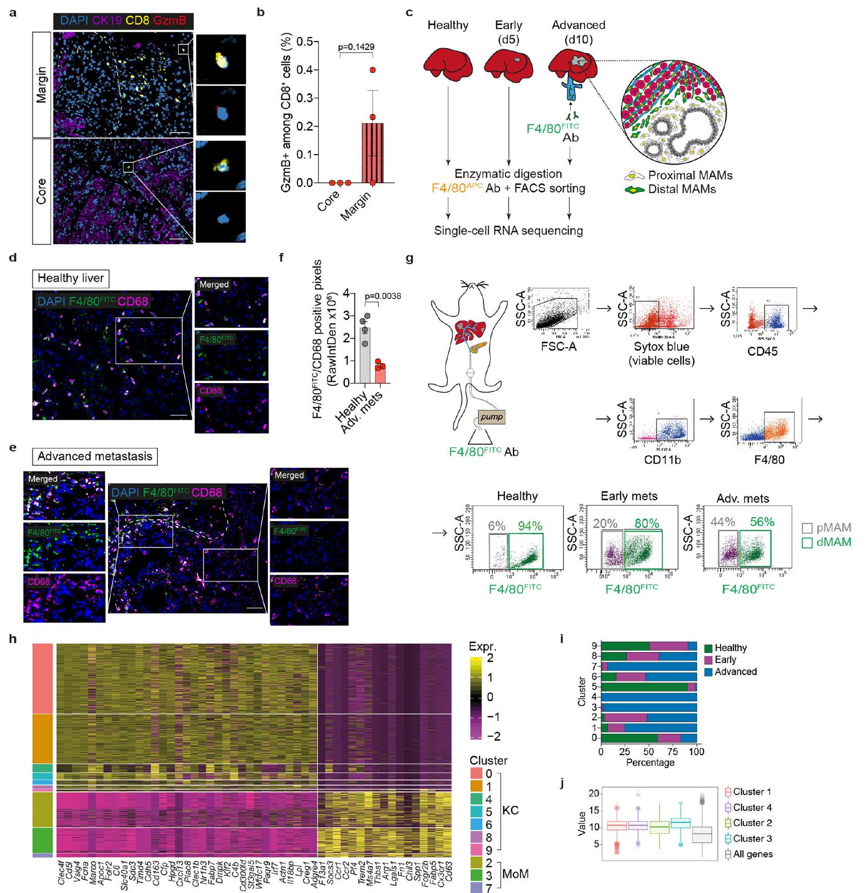 لتوصيف تباين MAM في نقائل سرطان البنكرياس في الكبد في الجسم الحي، قمنا بتحفيز نقائل الكبد عن طريق حقن الخلايا المعزولة من نموذج الفأر المعدل وراثيًا ‘KPC’ لسرطان البنكرياس (Kras; تر ب53 “; Pdx1-Cre)، في فئران تحمل أورام PDAC في الموقع. تم عزل MAMs بواسطة تحليل تدفق الخلايا وتم تحليلها باستخدام تسلسل RNA أحادي الخلية (scRNA-seq) (الشكل البياني الموسع 1c). قمنا بحل توزيع MAMs المكاني من الآفات النقيليّة المبكرة (اليوم 5) والمتقدمة (اليوم 10) باستخدام نهج وسم الأجسام المضادة في الموقع. الأورام الكبدية النقيليّة المتقدمة في PDAC هي ذات تليف عالٍ وقلة في الأوعية الدموية.التروية مع F4/80 المرتبط بـ FITCلذلك، فإن محلول الأجسام المضادة يلون بشكل رئيسي البلعميات في المنطقة المحيطية من الآفات النقيليّة.تظل البلعميات داخل النقائل غير ملونة (F4/80نحن نعرف البلعميات غير الملونة على أنها البلعميات القريبة من النقائل (pMAMs) والبلعميات الملونة على أنها البلعميات البعيدة عن النقائل (dMAMs).