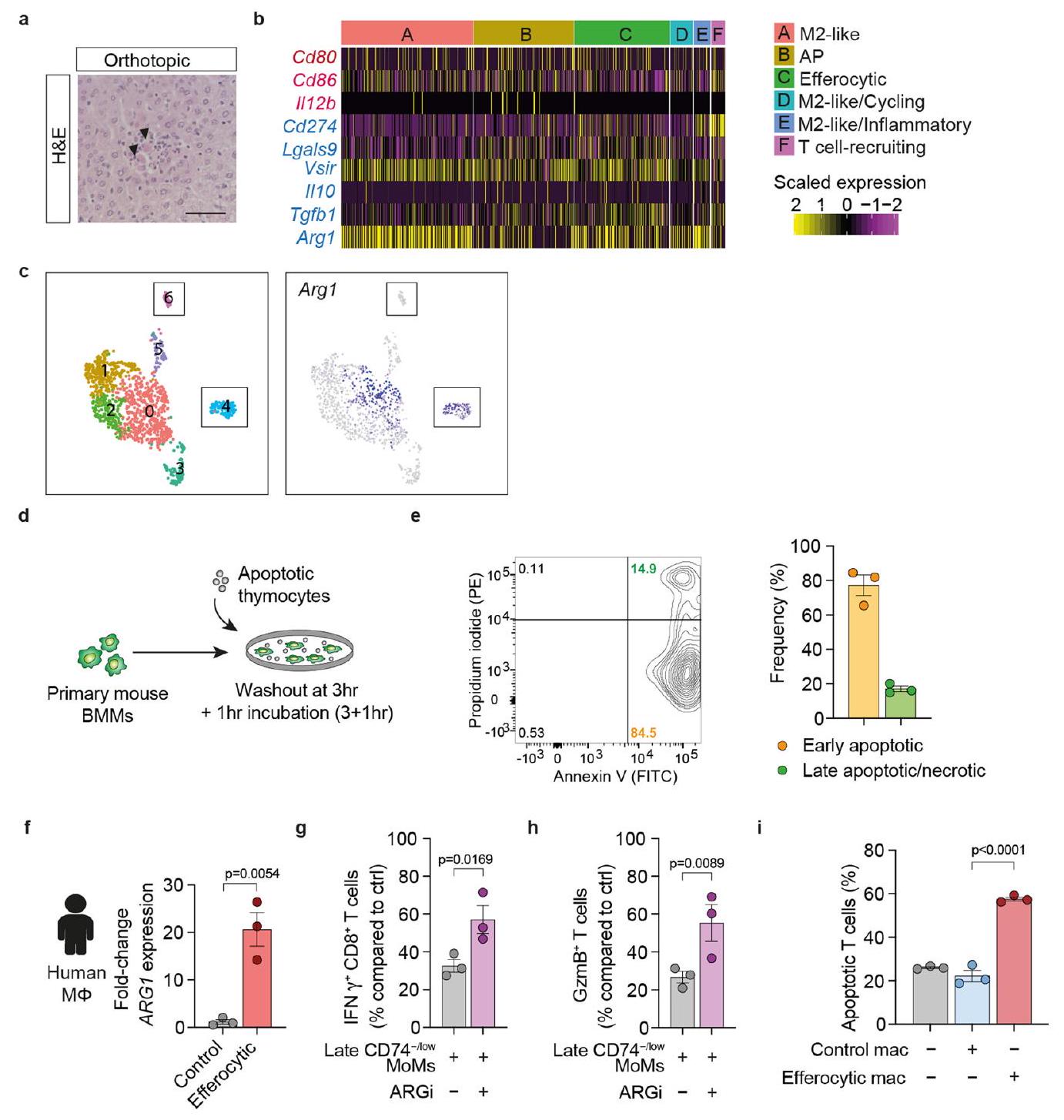 لتحديد الوسيط للنشاط المثبط للمناعة في مجموعة MoM المبكرة، قمنا بفحص تعبير الجينات المثبطة للمناعة في مجموعة MoM في بيانات scRNA-seq الخاصة بنا. مشابهًا لمجموعات M2like A/D/E، وجدنا تعبير الجين المثبط للخلايا التائية Arg1 في مجموعة MoMs C، والتي قد تكون مسؤولة عن النشاط المثبط للمناعة لمجموعات MoMs المبكرة CD74-/low (الشكل 3b من البيانات الموسعة). علاوة على ذلك، تم ربط الأرجيناز 1 بعملية الإيفيروسيتوز.تماشيًا مع وجود إصابة في الكبد قبل زراعة النقائل، تم العثور على تعبير عالٍ لـ Arg1 في تجمعات MoM المعزولة من أكباد ما قبل النقائل للفئران التي تم زرع الأورام فيها بشكل موضعي (الشكل التوضيحي الممتد 3c). أكدت تجارب زراعة الخلايا في المختبر باستخدام البلعميات الأولية من الفئران والبشر أن الإيفيروسيتوز هو كافٍ لتحفيز زيادة تعبير Arg1/أرجيناز 1 (الشكل 3f-h والشكل التوضيحي الممتد 3d-f).