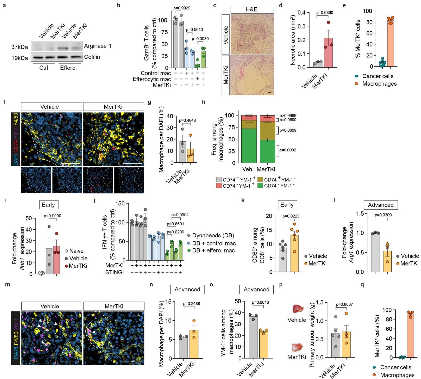 من الجدير بالذكر أنه حتى في الأورام النقيلي المتقدمة (d14)، أدى علاج MerTKi إلى تقليل تعبير Arg1 في MoMs (الشكل البياني الممتد 41) دون التأثير على وفرة MoMs بشكل عام (الشكل البياني الممتد 4m,n). علاوة على ذلك، احتوت الآفات المعالجة بـ MerTKi على عدد أقل من YM-البلاعم (الشكل البياني الموسع) )، مما يؤكد أن تثبيط الإيفيروسيتوز في الميتاستاز المبكر يعيق التحول الظاهري لخلايا الماكروفاج المستمدة من الدم (MoMs) خلال تقدم الميتاستاز في الجسم الحي.