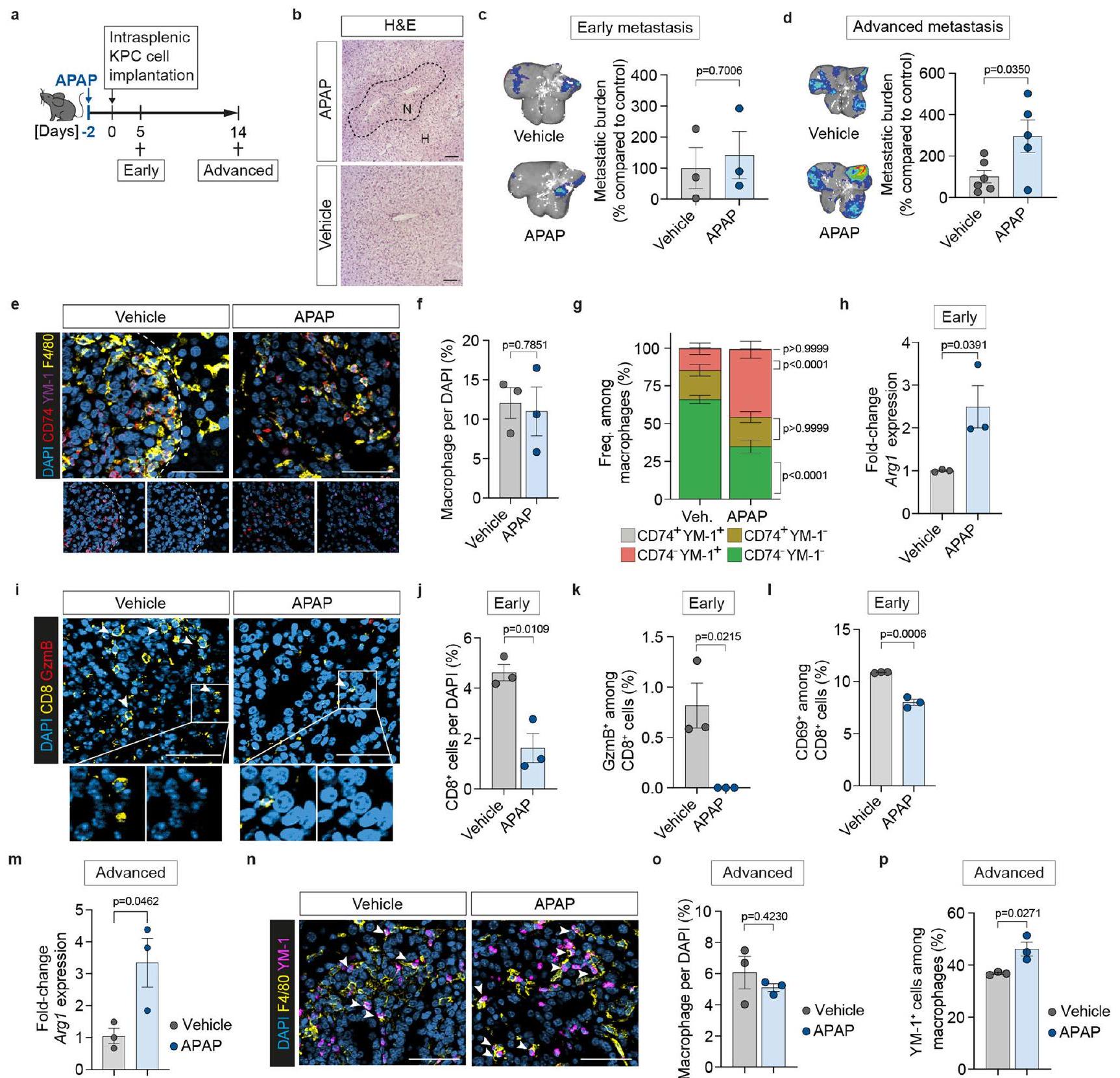 تسبب إصابة الكبد المرتبطة بالنقائل في ظهور نمط MAM المؤيد للورم، لذلك تساءلنا عما إذا كانت إصابة الكبد غير السرطانية تزيد من وجود MAMs المؤيدة للورم، مما يجعل الكبد أكثر قبولاً للنقائل. قمنا بتحفيز إصابة حادة في الكبد باستخدام جرعة واحدة من الباراسيتامول.-أسيتيل-بارا-أمينوفينول؛ APAP). بعد يومين، خضعت الحيوانات لزراعة خلايا سرطان البنكرياس داخل الطحال (الشكل البياني الموسع 5a). كما هو متوقعتسبب تناول الـ APAP في نخر الكبد بعد 24 ساعة من الإعطاء (الشكل 5b من البيانات الموسعة). أظهر العلاج المسبق بالـ APAP تأثيرًا هامشيًا على النمو المبكر للنقائل (الشكل 5c من البيانات الموسعة)، ولكنه أدى إلى زيادة كبيرة في عبء الورم في المرحلة المتقدمة مقارنةً بالعلاج المسبق بالدواء الوهمي (الشكل 5d من البيانات الموسعة). لم يؤثر العلاج المسبق بالـ APAP على CD74.YM-1الخلايا المناعية في الآفات النقيليّة المبكرة (الشكل التوضيحي الإضافي 5e-g) ولكنها قللت من نسبة الخلايا المناعية CD74- YM-1- وزادت من الخلايا المناعية CD74- YM-1+ (الشكل التوضيحي الإضافي 5e-g)، مما يشير إلى تسريع تحويل الخلايا المناعية إلى النمط الشبيه بالمرحلة المتأخرة M2.تم تقليل MoMs مع معالجة سابقة بـ APAP مقارنة بالحيوانات المعالجة بالسيارة (الشكل 5h من البيانات الموسعة)، في حين أن CD8تسلل الخلايا (الشكل البياني الممتد 5i، j) وحالتها السامة/حالة تنشيطها (الشكل البياني الممتد 5i، k، l) كانت منخفضة بشكل ملحوظ. أظهرت الآفات النقيليّة المتقدمة في الفئران المعالجة مسبقًا بـ APAP زيادة مستدامة في تعبير Arg1 (الشكل البياني الممتد 5m)، في حين أن أعداد MoM لم تتغير (الشكل البياني الممتد 5n، 0). كانت النسبة المتزايدة من YM-1تم العثور على البلعميات الكبيرة مقارنة بتلك الموجودة في كبد التحكم المستمد من المركبة (الشكل البياني الموسع 5n، p).