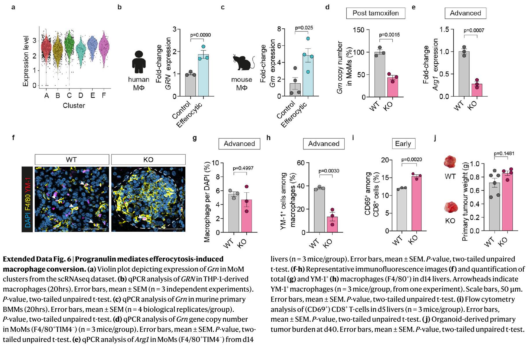 اختبرنا ما إذا كان استنفاد البروجرانولين المحدد للماكروفاج يؤثر على استقطاب MAM خلال انتشار سرطان البنكرياس إلى الكبد في الجسم الحي. قمنا بزرع خلايا سرطان البنكرياس داخل الطحال في نماذج Csf1r-MerCreMer المشروطة؛ Grn.فئران (KO) مع Csf1r-MerCreMer ؛ Gr (WT) كفئة تحكم. في سلالة KO، يؤدي إعطاء التاموكسيفين إلى استنفاد البروجرانولين في البلعميات. (الشكل 5h والشكل الإضافي 6d). أدى الاستنفاد المحدد للبروجرانولين في البلعميات إلى تقليل كبير في عبء الورم النقيلي في المرحلة المتقدمة (الشكل 5i، j). أدى استنفاد البروجرانولين إلى تقليل تعبير Arg1 في MoMs المعزولة (الشكل 5k). وقد استمر هذا الانخفاض في الميتاستاز المتقدم (الشكل الإضافي 6e) جنبًا إلى جنب مع انخفاض فيالبلاعم، في حين أن وفرة البلاعم ظلت غير متأثرة (الشكل 6f-h من البيانات الموسعة). أدى نقص البروجرانولين في البلعميات إلى زيادة كبيرة في الإجماليأرقام الخلايا (الشكل 51، م)، في السمية الخلويةالخلايا (الشكل 51، ن) وفي الحالة المنشطةالخلايا (الشكل البياني الإضافي 6i) في الكبدات النقيليّة المبكّرة.