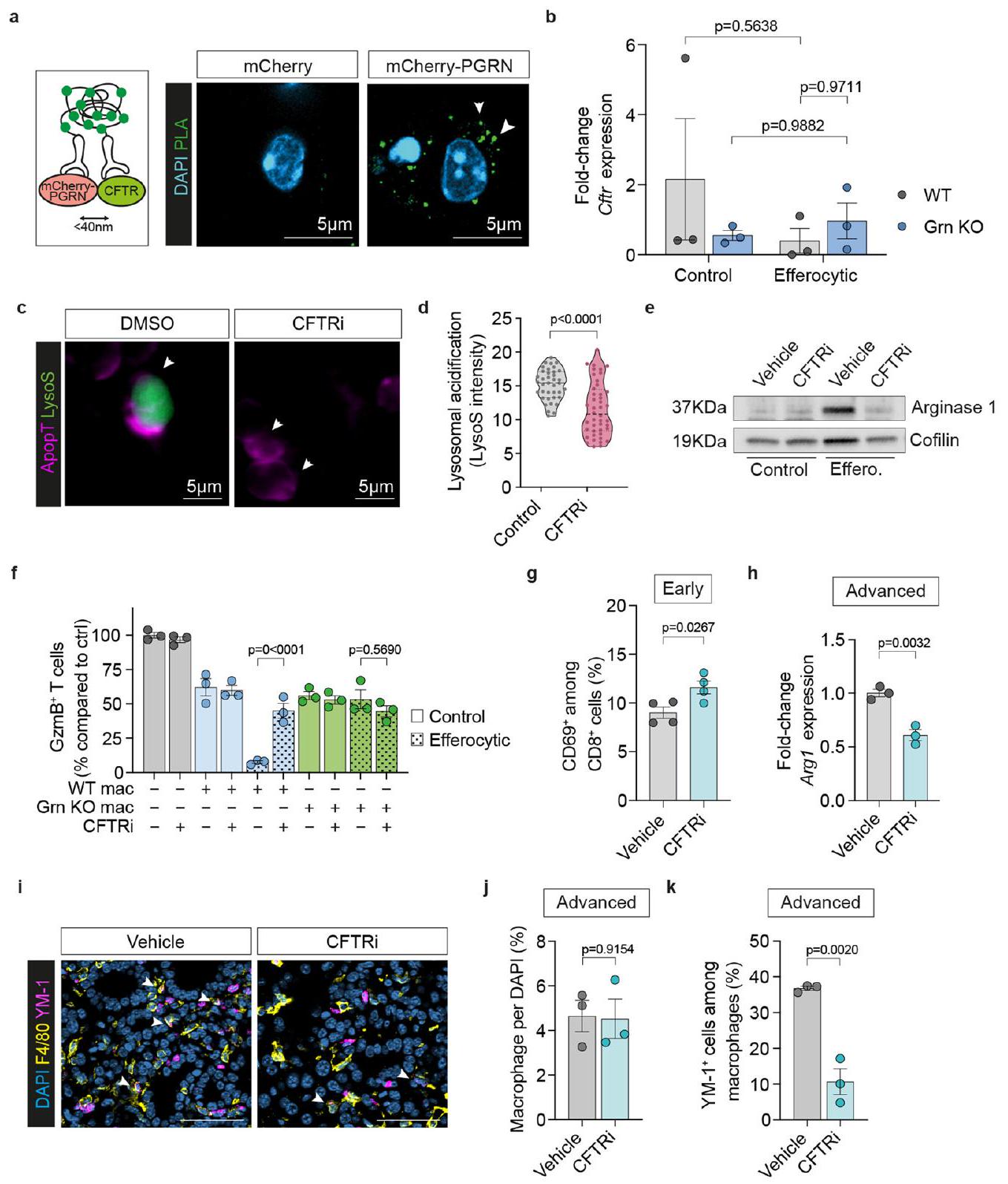 التثبيط الدوائي لـ CFTR باستخدام CFTRinh172 (CFTRi) أثر بشكل كبير على حموضة الليسوزومات الناتجة عن الإيفيروسيتوز في البلعميات (الشكل التمديدي 8c، d). بالإضافة إلى ذلك، أدى تثبيط CFTR في المختبر إلى تقليل تعبير Arg1 بشكل كبير (الشكل 7b والشكل التمديدي 8e) وألغى الأنشطة المناعية المثبطة المتزايدة للبلعميات WT الإيفيروسيتية، لكنه لم يظهر أي تأثير على البلعميات التي تفتقر إلى البروجرانولين (الشكل 7c والشكل التمديدي 8f).