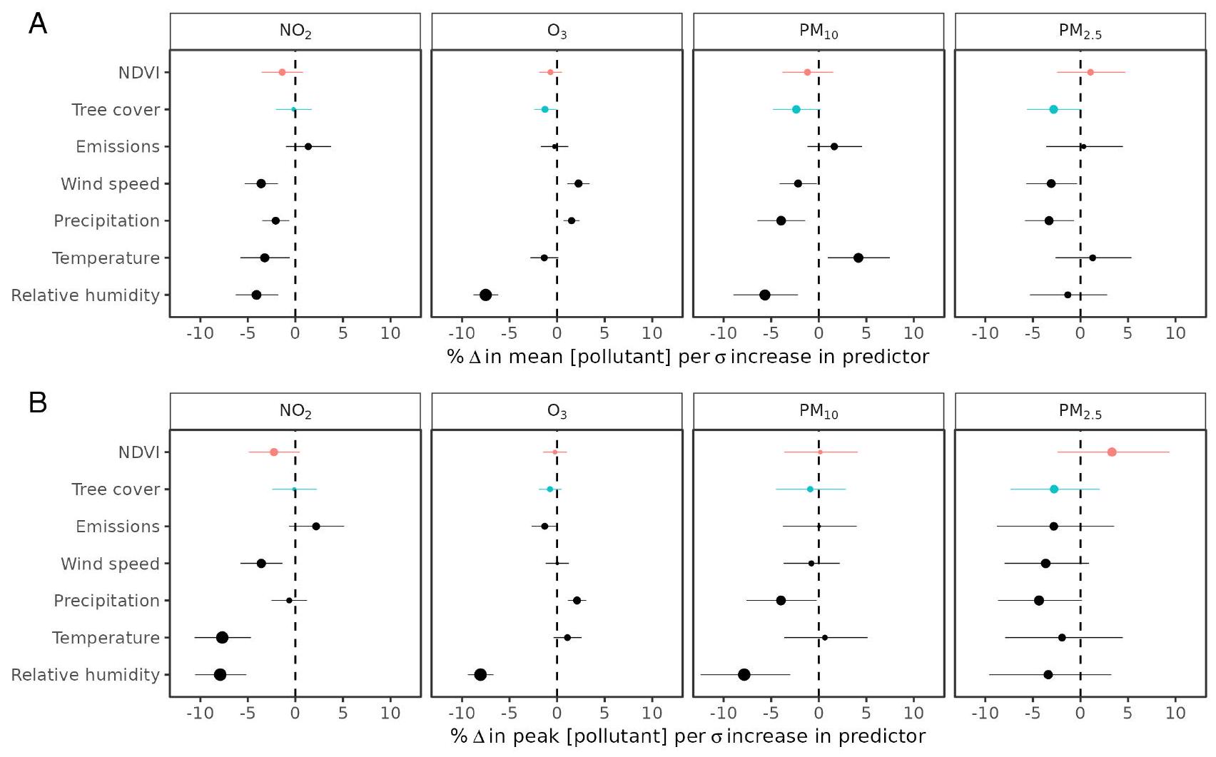 كان للمساحات الخضراء تأثير إيجابي. كانت التغيرات داخل بيئة الغابات الصنوبرية تدفع هذا الاستجابة المتباينة (الشكل 3B). بالمقابل، كان لكل من المساحات الخضراء الإجمالية وتغطية الأشجار تأثيرات سلبية على تركيزات الجسيمات الدقيقة في بيئات السافانا/المراعي، على الرغم من وجود تباين أكبر في تأثيرها كما هو موضح بواسطة فترة الثقة 95%.