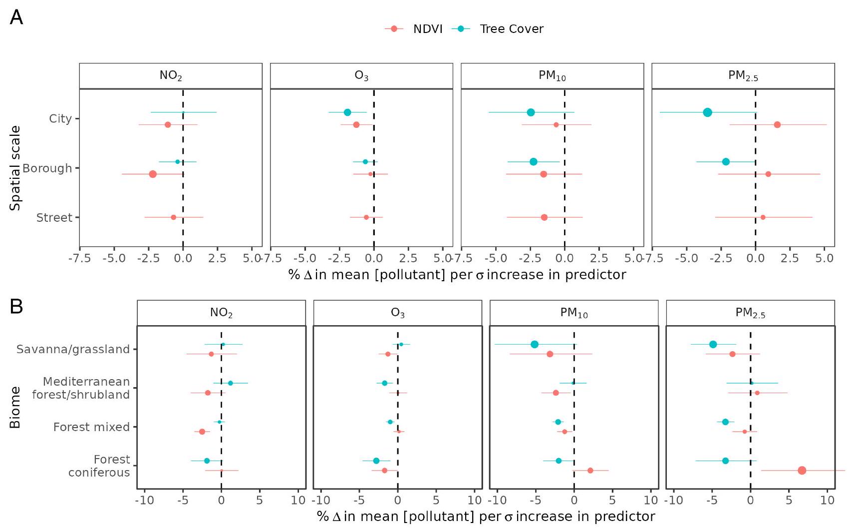 green space had a positive effect. Changes within the coniferous forest biome were driving this divergent response (Fig. 3B). In contrast, both total green space and tree cover in particular had negative effects on PM concentrations in the savanna/grassland biomes, albeit with greater variation in their effect as indicated by 95% CI.