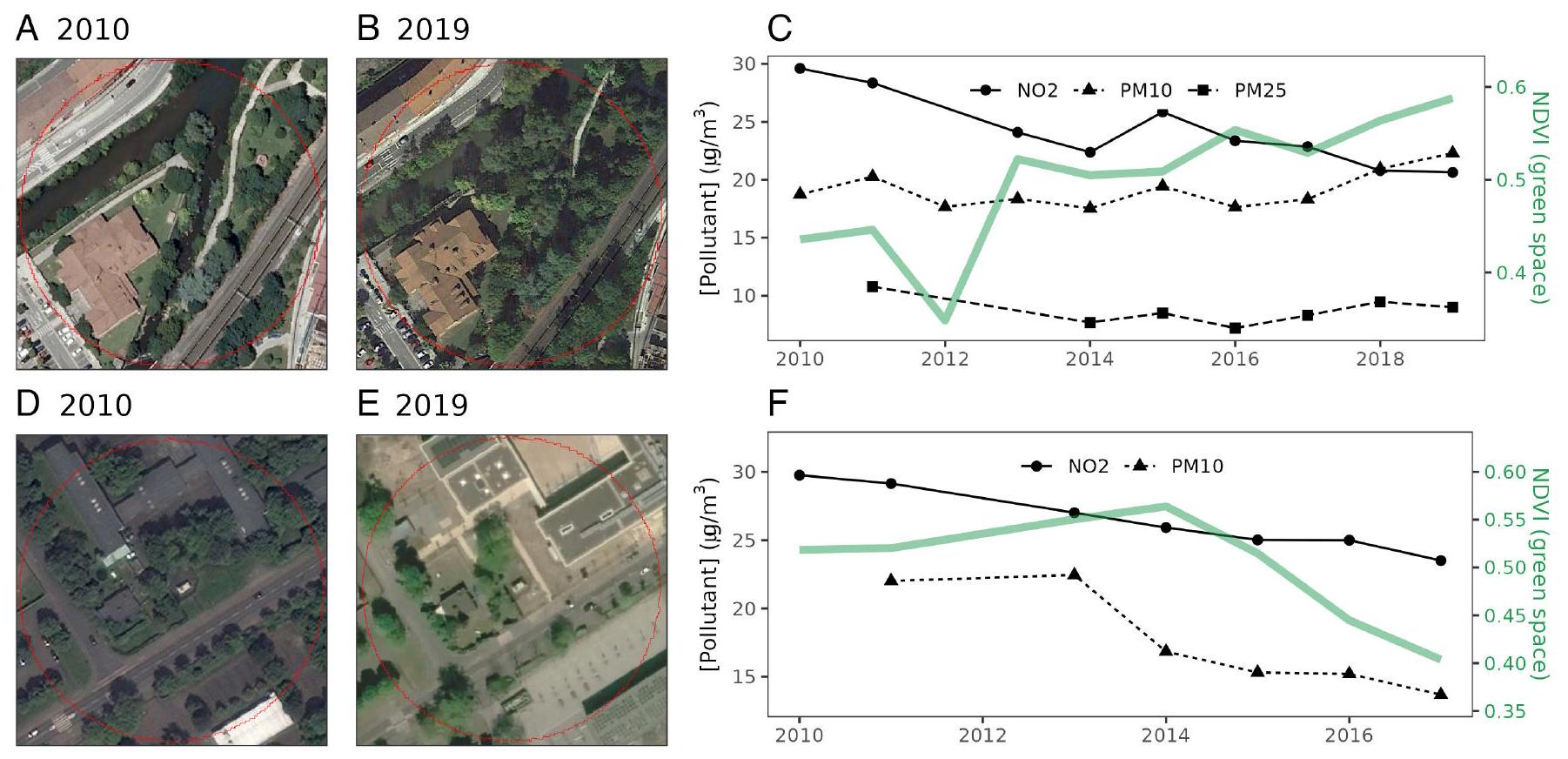 أي تأثيرات محددة للنموذج. تم تحويل تركيزات الملوثات الهوائية إلى لوغاريتمات لضمان توزيع المتبقيات بشكل طبيعي. ii) لت quantifying العلاقة بين المساحات الخضراء وتركيز الملوثات الهوائية على مر الزمن مع التحكم في تأثير الانبعاثات والمتغيرات المناخية، قمنا بتطبيق نفس هيكل النموذج الموصوف أعلاه، باستثناء إضافة المساحات الخضراء (NDVI وتغطية الأشجار) والانبعاثات والمتغيرات المناخية كأثر ثابت. تم تطبيق نماذج منفصلة لكل بيئة ولكل منطقة عازلة استخدمت لتجميع المساحات الخضراء حول المحطات. iii) تم استخدام المحطات التي تم فحصها يدويًا والتي شهدت تغييرات شديدة في NDVI لتطبيق نماذج مختلطة لاختبار ما إذا كانت الانخفاضات في تلوث الهواء أكبر في المحطات التي شهدت زيادة في المساحات الخضراء مقارنة بالمحطات التي شهدت انخفاضًا في المساحات الخضراء. تم تضمين الاتجاهات الخطية في المتغيرات المناخية وكسب/فقدان تصنيفي في المساحات الخضراء كأثر ثابت، بينما تم تضمين العينة كأثر عشوائي للتحكم في أي تحيزات محددة للعينة في تفسير الصور الجوية.