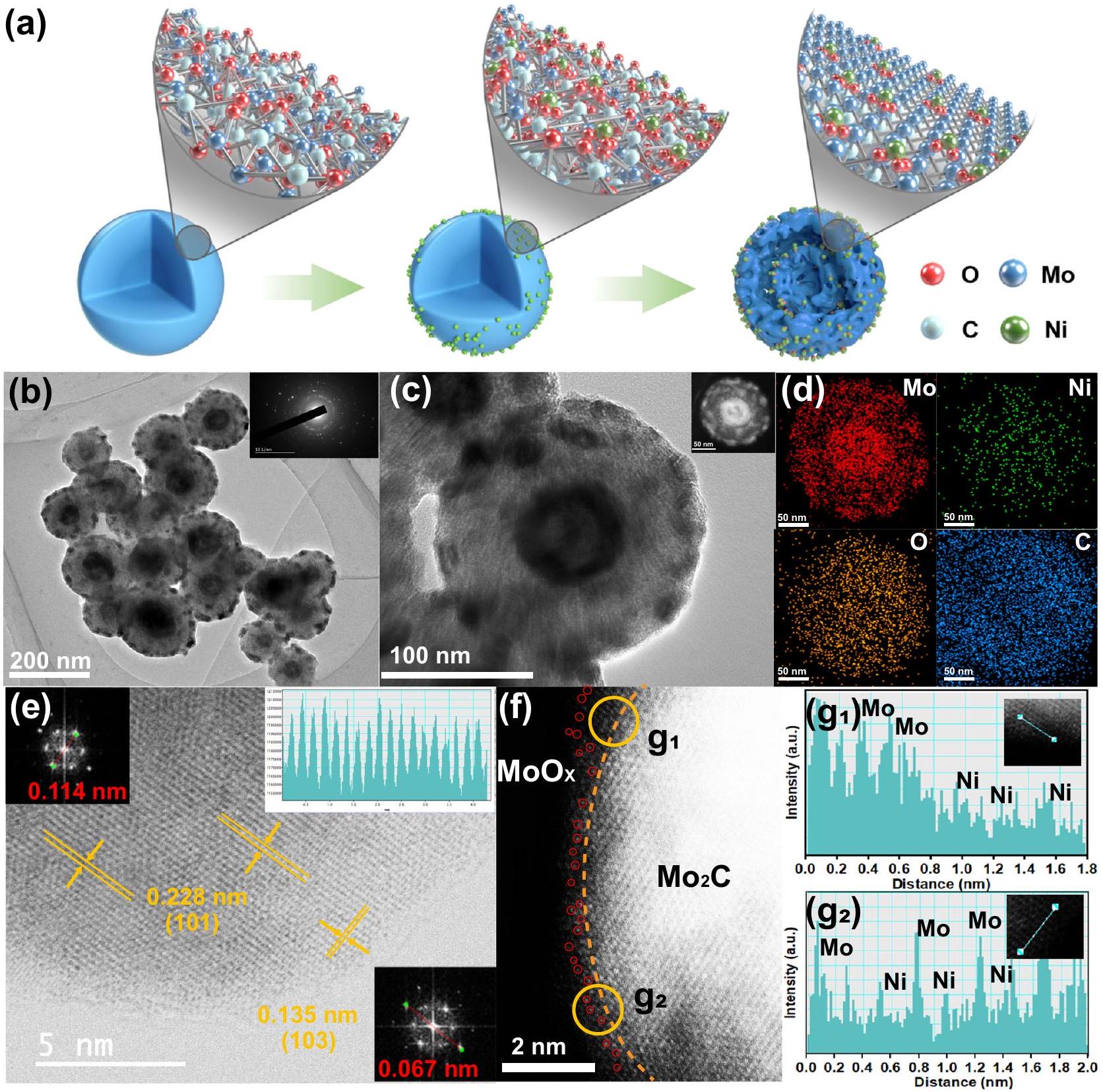التم تصنيع الكرات النانوية من خلال الخطوات التالية: (1) تحضير سوائل نانوية عضوية قائمة على الموليبدينوم بطريقة هيدروحرارية سهلة؛ (2) امتصاص أيونات معدن النيكل عبر طريقة النقع؛ (3) معالجة حرارية عند درجات حرارة معينة تحت الهواء والجو. خلال عملية التحلل الحراري، تم تحويل المواد الأولية العضوية المعتمدة على الموليبدينوم في الوقت نفسه إلىبلورات نانوية تحتوي على أيونات النيكل مثبتة على أسطحها، والتي تم تضمينها في ركيزة كربونية موحدة. تظهر صور المجهر الإلكتروني الناقل (TEM) في الشكل S1 أن المادة السابقة غير المتبلورة المعتمدة على الموليبدينوم هي هيكل كروي نانوي ذو أسطح خشنة بقطر حوالي 200 نانومتر، ولا يتغير الشكل بشكل ملحوظ بعد امتصاص أيونات النيكل على السطح (الشكل S2). بعد التحلل الحراري، يمكن ملاحظة هيكل مجوف ذو قشرتين بوضوح (الشكل 1a، b). تم دراسة آلية تكوين الهيكل المجوف ذو القشرتين بالتفصيل (الأشكال S3-S6) ورسم توضيحي محتمل له موضح في الشكل S7، والذي يعتمد بشكل أساسي على الأكسدة المبكرة للهواء والانكماش غير المتوازن وغير المتجانس الناتج عن المعالجة الحرارية.أثناء تشكيل الهيكل المجوف ذو القشرة المزدوجة، كانت ظروف الهواء والجوين مهمان للغاية. بالإضافة إلى ذلك، فإن المساحات السطحية المحددة المستمدة منتظهر منحنيات الامتزاز-التحرر زيادة ملحوظة من 13.9 لـإلىلـ (الشكل S8)، والذي يرجع على الأرجح إلى تطاير النترات من مصادر النيكل. تشير أنماط حيود الأشعة السينية (XRD) (الشكل S9) إلى أن حيود يمكن أن يتم فهرسته بشكل جيد إلى النقي المرحلة (رقم بطاقة JCPDS 35-0787) لا يمكن ملاحظة قمم لمعدن النيكل، ولا أكسيد المعدن. نمط حيود الإلكترونات في المنطقة المختارة (المُدرج في الشكل 1ب) يشير إلى تعدد الأشكال لـ.