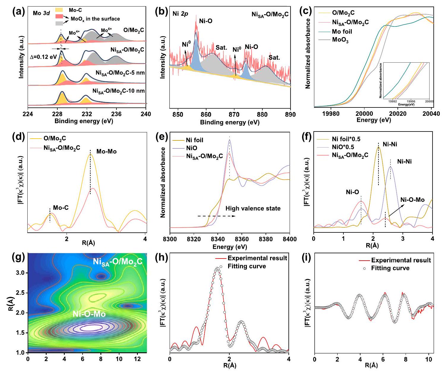 لتقييم التركيب الإلكتروني والبيئة المحلية للنيكل والموليبدينوم فيتمت دراسة طيف الامتصاص القريب من حافة الأشعة السينية (XANES) وبنية الامتصاص الدقيق الممتدة للأشعة السينية (EXAFS). تظهر طيف XANES عند حافة Mo K في الشكل 2c. بالمقارنة مع النقيالحافة السابقة لـكان أعلى، مما يشير إلى أن متوسط حالة الأكسدة لمعدن الموليبدينوم في الـكان أكثر إيجابية، وهو ما يتماشى مع نتائج XPS المذكورة أعلاه. تحويل فورييه (FT) لـ EXAFS الممتد (الشكل 2d) للنقي و يمتلك قمتين. القمة الأقوى تقع في، الذي يتوافق مع روابط مو-مو. القمة الأخرى تقع عندالتي ترتبط بروابط Mo-C. بالمقارنة مع O النقي/، فإن إدخال النيكل سيعمل على توسيع و طول الرابطة بسبب التفاعل بين النيكل والحدود السابقة لحد Ni K يقع بين Ni و NiO (الشكل 2e)، مما يشير إلى أن حالة أكسدة Ni في هو موجود بين 0 و +2. طيف XANES عند حافة النيكل K والطيف المقابل في فضاء k لـتشبه بشكل وثيق مرجع NiO (الشكل )، مما يشير إلى تشكيل السطح التحويل فورييه (FT)طيف EXAFS الموزون في فضاء R أكد بشكل إضافي على تشكيلعلى الطبقة الرقيقة غير المتبلورةعلى سطحكما هو موضح في الشكل 2f، هناك قمة ملحوظة عندمساهم من قبليتم ملاحظة الذروة. الـ FTمن رقائق النيكل تظهر قمة عندوNiO يظهر قمة عندكلاهما يتوافق مع تفاعل.لا تحتوي على هذه القمم، مما يدل على أن ذرات النيكل يجب أن توجد في شكل ذري مفرد على الطبقة الرقيقة غير المتبلورة.. بالإضافة إلى ذلك، هناك قمة تشتت عند حوالي ، والذي قد يكون بسبب ارتباطبالإضافة إلى النتائج المذكورة أعلاه لسطح المؤكسديجب أن تسود الروابط على السطح.