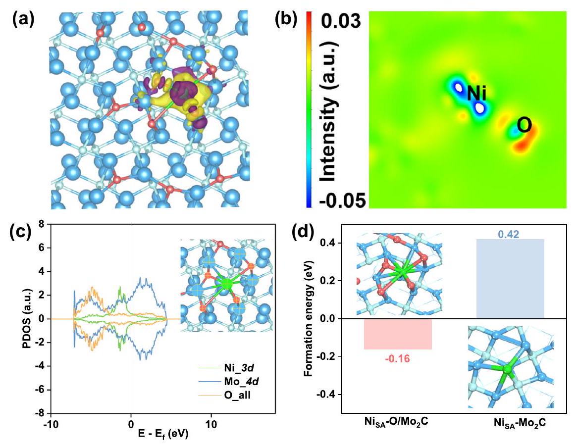 من أجل دراسة آلية ارتباط ذرات النيكل مع الأكسجين المدمج، قمنا بإجراء سلسلة من حسابات DFT. وفقًا للنتائج السابقة للتحليل الهيكلي، اخترنا المستوى (101) منكسطح تفاعل. ثم تم إجراء حسابات على امتصاص ذرات الأكسجين على السطح، وحددنا الهيكل الأكثر استقرارًا (الشكل S18) من خلال مقارنة قيم طاقتها الكلية. لذلك، قمنا بإرفاق بعض ذرات الأكسجين بالوجه من خلال أقوى امتصاص لمحاكاة سطح مؤكسد جزئيًا منوفقًا للبيانات أعلاه، قمنا بامتصاص ذرة النيكل المرتبطة بأربع ذرات أكسجين وذرة كربون واحدة على السطح، للحصول على نماذج حسابية. و (الشكل S19). أولاً، قمنا بإجراء حسابات فرق كثافة الشحنة بين النيكل والوجه، كما هو موضح في الشكل 3a و 3b. يمكن رؤية ميل واضح لنقل الإلكترونات من موقع النيكل إلى الذرات المحيطة، مما يشير إلى التفاعل بين النيكل والوجه. وهذا ما تم تأكيده أيضًا من خلال الشكل 3c، بسبب التداخلات بين المدارات لذرات النيكل والأكسجين والموليبدينوم (المعلمة بعلامة X) حول مستوى فيرمي. لذا، استنتجنا أن ذرات النيكل يمكن أن تُمتص بشكل مستقر على الوجه المؤكسد جزئيًا.. بالإضافة إلى ذلك، فإن قيمة طاقة الامتزاز عندكان أقل بكثير من (الشكل 3د)، مما يشير بشكل أكبر إلى أن ارتباط Ni-O-Mo كان أكثر استقرارًا.