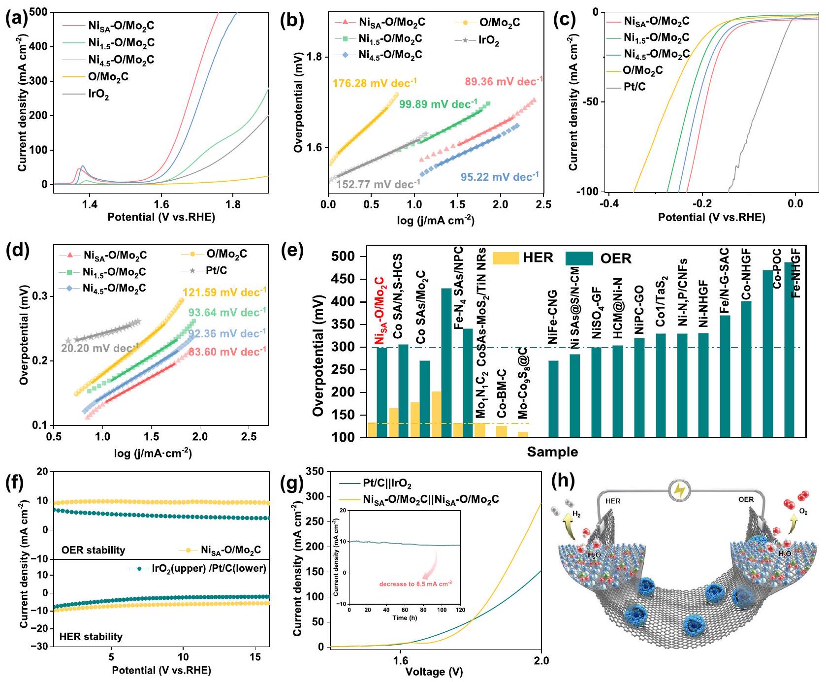 OH. تمثل المدرجات في اللونين الأصفر والأخضر أداء HER و OER على التوالي.كثافة التيار مقابل الزمن ) منحنيات القطبية لـ HER و OER. g منحنيات القطبية لـ و الأزواج لتفكيك الماء بشكل عام في 1.0 م كوه (كمية التحميل ). إدراج هو المتانة على المدى الطويل لعملية تحليل الماء بشكل عام عند كثافة تيار. ه توضيح لـأقطاب كهربائية لتفكيك الماء بشكل عام. المعكوس من سعة الطبقة المزدوجة ( ) (الشكل S23). العامل المساعد لديه الأعلىالقيمة، التي تشير إلى أنلديها مساحة سطح نشطة مكشوفة أكبر من العينات الأخرى. نظرًا لأن النشاط النوعي يعكس النشاط الجوهري للتفاعل الحفزي، تم عرض منحنيات LSV المعدلة حسب ECSA لكل من HER وOER في الشكل S24. يظهر النشاط النوعي (SA) المعدل حسب ECSA أنتظهر أفضل نشاط كهرومحفز تجاه كل من OER و HER مقارنةً بالمواد المحفزة الأخرى وفقًا للترتيب التالي. بشكل خاص بالنسبة لتفاعل أكسدة الماء، عند جهد زائد قدره 370 مللي فولت (الشكل S24d)، يعرض SA بمقدار 8.71، وهو أعلى من تلك الخاصة بـ و تشير هذه النتائج إلى أن دمج النيكل لا يحسن فقط كثافة المواقع النشطة ولكن أيضًا يحسن بشكل جوهري نشاط تفاعل الهيدروجين (HER) وخاصة نشاط تفاعل الأكسدة (OER).المحفز. تعتبر متانة المحفز مؤشرًا مهمًا، خاصة بالنسبة لـ SACs. بالنسبة لتفاعل الأكسدة، تم إجراء التحليل الكهربائي على المدى الطويل عند تيار ثابت تحت تيار ثابت منعن طريق الكرونوأمبرو متري لمدة 16 ساعة (الشكل 4f)، مما أثبت أن التيارات لـزيادة أولاً ثم الحفاظ على الاستقرار لفترة طويلة. بالمقابل، بعد 16 ساعة، تجاريالمحفز يظهر اختلافًا واضحًا في الجهد الزائد المطلوب. بالنسبة لتفاعل تقليل الهيدروجين، على الرغم من أنه كان أكثر استقرارًا بكثير منكثافة الحالية لـانخفض المحفز قليلاً بعد 16 ساعة.