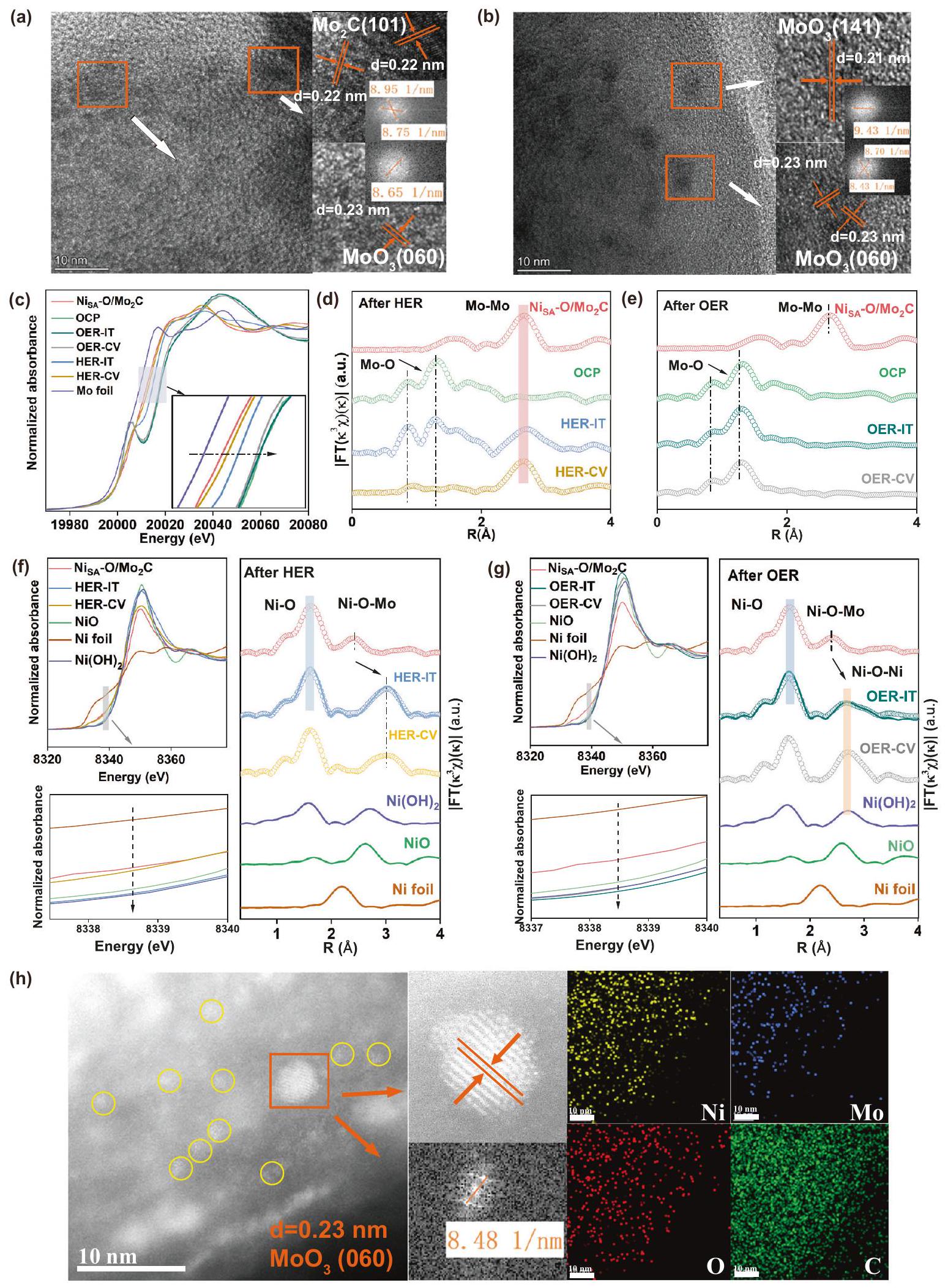 In order to reveal the different stability phenomena of HER and OER, a series of characterizations were carried out to probe the identity of the real catalytically active species. The XRD pattern (Fig. S26a) indicates that the surface of undergoes structural reorganization to form different phases after the different electrochemical reactions. After electrochemical HER, the catalyst maintains the diffraction peaks of , but other weaker peaks of (JCPDS card no.35-0609) and (JCPDS card no.29-1021) appear. In contrast, for OER, all the XRD peaks could be assigned to the crystal structures of (JCPDS card no. 05-0508 and 35-0609) and without peaks, indicating the were completely disintegrated. Fig. S 27 shows the spectra of after reactions, the major Mo peaks can be assigned to without low valence state of Mo, suggesting the average oxidation state of Mo are both higher than that of , that is to say the surface of the catalysts both have obvious oxidation behavior . However, after HER reaction, the peak shifted to a little lower position, which is probably due to the interaction between single atom Ni and the reconstructed substrate. The morphology of double-shelled hollow structure was not obviously changed after catalytic reactions (Fig. S2830). However, in the case of after HER, the enlarged HRTEM image shows original large nanoparticles were crushed into smaller ones and two different lattices of 0.22 nm and 0.23 nm correspond to the d -spacing of (101) and (060) planes of the and , respectively (Fig. 5a, b). Besides, in the after OER, the image exhibits the big nanoparticles were changed obviously to smaller ones and the interplanar spacings of 0.21 and 0.23 nm correspond to the (141) and (060) plane of . These results indicate that undergoes reconstitution in the process of HER and OER. So, in order to determine the real active species involved in these two reactions, ex-situ XANES and FT-EXAFS spectra after CV and i-t chronoamperometric test for HER and OER were further recorded. As displayed in Fig. 5c, the Mo K-edge XANES spectra for catalysts after HER and OER activation show both positive shifts in the absorption edge compared with that of , indicating the valences Mo oxidation states were increased. However, for catalysts after OER, the Mo K-edge XANES spectra show more positive shifts compared with that of catalysts after HER, indicating catalysts after OER has higher valence state of Mo, which consistent with XPS results. In addition, a new notable shoulder peak in the pre-edge region of OER were shown, suggesting the formation of strongly distorted octahedra. Figure show the Mo -weighted FT-EXAFS spectra of after HER and OER, respectively. After HER, it shows the main peak centered at , corresponding to the scattering in . In particular, two smaller peaks located at around and can be found, which are typical characteristic of Mo-O bonds, indicating the surface of was further oxidized . In contrast, after OER, the spectra display the existence of the Mo-O bond but no Mo-Mo bond, and its shape is similar with that of molybdate, indicting, except for crystal , amorphous or low crystallinity molybdate was also formed followed by the possible reaction of . In order to clary whether the changes of is automatic in KOH KOH electrolyte at open circuit potential (OCP). As shown in Fig. conditions, we tested the XRD, Mo k-edge XANES and FTEXAFS curve for electrocatalysts after being dipped into KOH electrolyte at open circuit potential (OCP). As shown in Fig. S26b, the electrocatalysts after being dipped into KOH electrolyte at OCP ( ) has similar characteristic peaks with after HER except the a little weaker and peaks. Based on the dissolution of in , we speculate the original surface reacts with KOH to form , and with the consumption of surface surface is continuously oxidized to form new surface until the is completely dissolved in KOH . However, compared with after has characteristic peaks of . In addition, compared with and after HER, the absorption edge of was higher, suggesting its average oxidation state of Mo was more positive. Meanwhile, the Mo k-edge XANES shape and the Mo k3-weighted FT-EXAFS spectra of are different from after HER but similar with that of after OER. These results indicate the dissolution and oxidation of in KOH is automatic in alkaline conditions. The applied oxidation potential of OER process will intensify these two continuous reaction processes, while HER process will inhibit to a certain extent the oxidation of the inner layer of and then partially prevent the formation of from the outer layer of . Based on the dissolution of in KOH , Fig. 5f, g present comparisons of catalysts in Ni K-edge XANES and FT-EXAFS after HER and OER. In the case of HER (Fig. 5f), the pre-edge position of XANES spectra show a slight shift to higher energy values compared with the original , indicating that the Ni oxidation state slightly increases but still between and . After carefully compared the FT-EXAFS spectra of before and after HER, we found the peak of O did not change, however the position of Ni-O-Mo was shift to higher R , which due to the reconstitution of substrate. After EXAFS fitting, we found the distance of is almost the same as that of and is increased from 2.40 to (Table S7). Moreover, the Ni-O coordination number increased to 5.90 while the Ni-Mo decreased to 4.50 . And no typical peaks for NiNi bonds are observed as well. These results indicated the Ni was still exists as single atoms while its coordination structure had changed slightly. This catalyst after HER was collectively denoted as . In contrast, after OER (Fig. 5 g ), the position of the absorption edge is higher than that of the reference, indicating the Ni has the higher oxidation than +2 , which probably due to the existence of NiOOH or the strong electron interaction between and the reconstructed substrate (Fig. S31). For the FT-EXAFS spectra of the Ni K-edge after OER, these shapes match well w