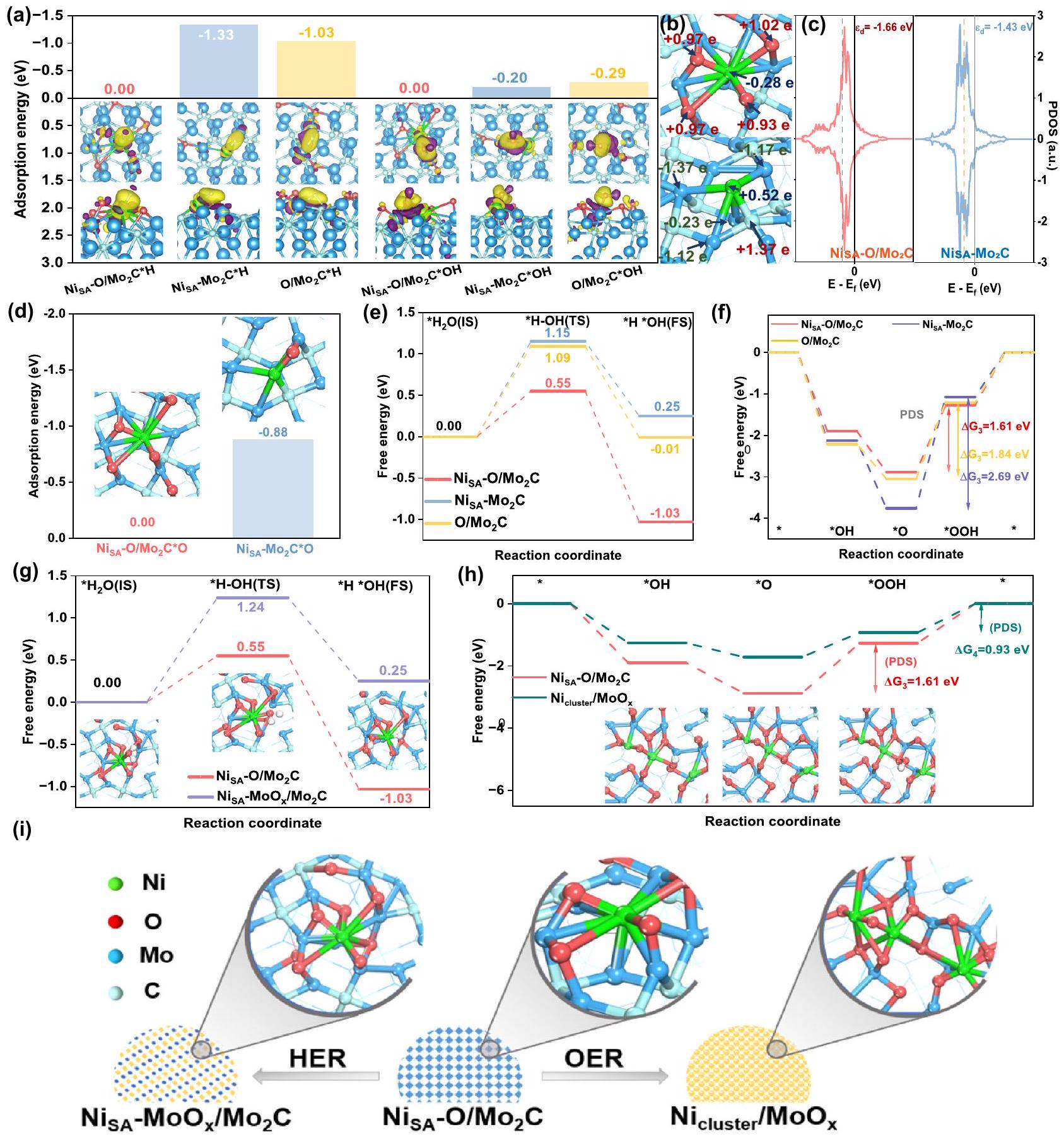 Based on the above results, it would be found that the partially oxidized surface of facilitated the binding of Ni atoms via and (Ni-O-Mo) chemical bonds, thus promoting the electrocatalytic properties of HER and OER. However, the substrate of after HER and OER underwent oxidation and dissolved. For after HER (Fig. 6g, S36), we can see that its energy barrier of water dissociation is 1.24 eV , which becomes larger than that of , indicating the overoxidation of the substrate can lead to some adverse hydrogen evolution effects. But for after OER, the PDS changes from the step pf *O to *OOH to the step of *OOH to . Its free energy of the rate-determining step is 0.93 eV (Fig. 6h), which becomes smaller than that of at . In addition, compared with , the reconstructed shows a weaker adsorption capacity of (Fig. S37), indicating the reconstructed accelerates the oxygen evolution reaction. These results indicate the overoxidation of the substrate is conducive to the aggregation of monatomic Ni into clusters and the improvement of oxygen evolution performance. Figure 6i shows the structural reconstitution of catalyst after different reaction processes. These results are consistent well with the experimental observations.