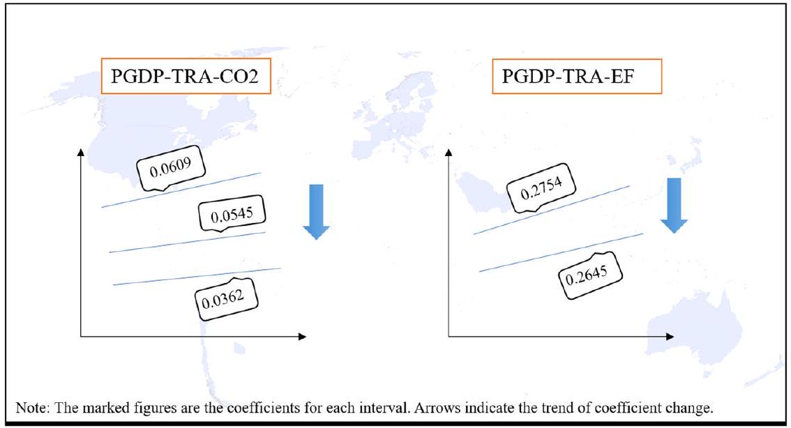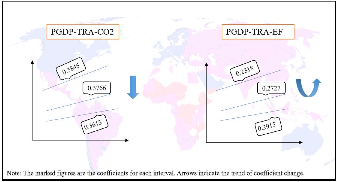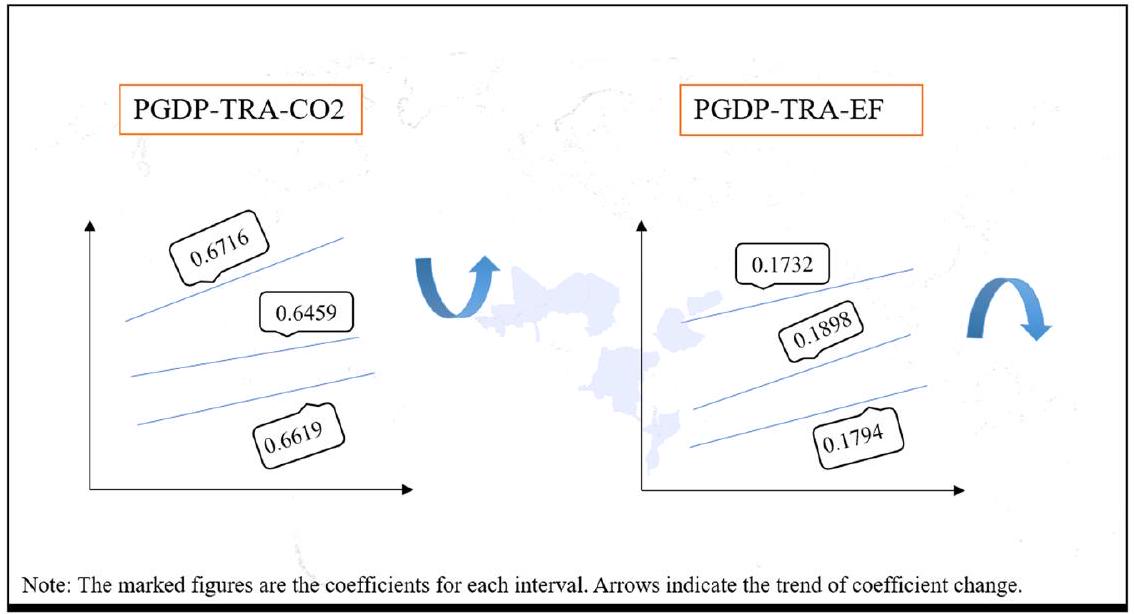 أن استخدام التجارة كمتغير عتبة يقسم تأثير النمو الاقتصادي على انبعاثات الكربون إلى ثلاثة فترات. عندما يكون LnTRA أقل من 4.188، يكون معامل تأثير الناتج المحلي الإجمالي للفرد على ثاني أكسيد الكربون 0.3845. عندما يكون LnTRA بين 4.188 و 5.019، يكون معامل الانحدار 0.3766. عندما يكون LnTRA أكبر من 5.019، يكون المعامل 0.3613. التأثير الإيجابي لـ