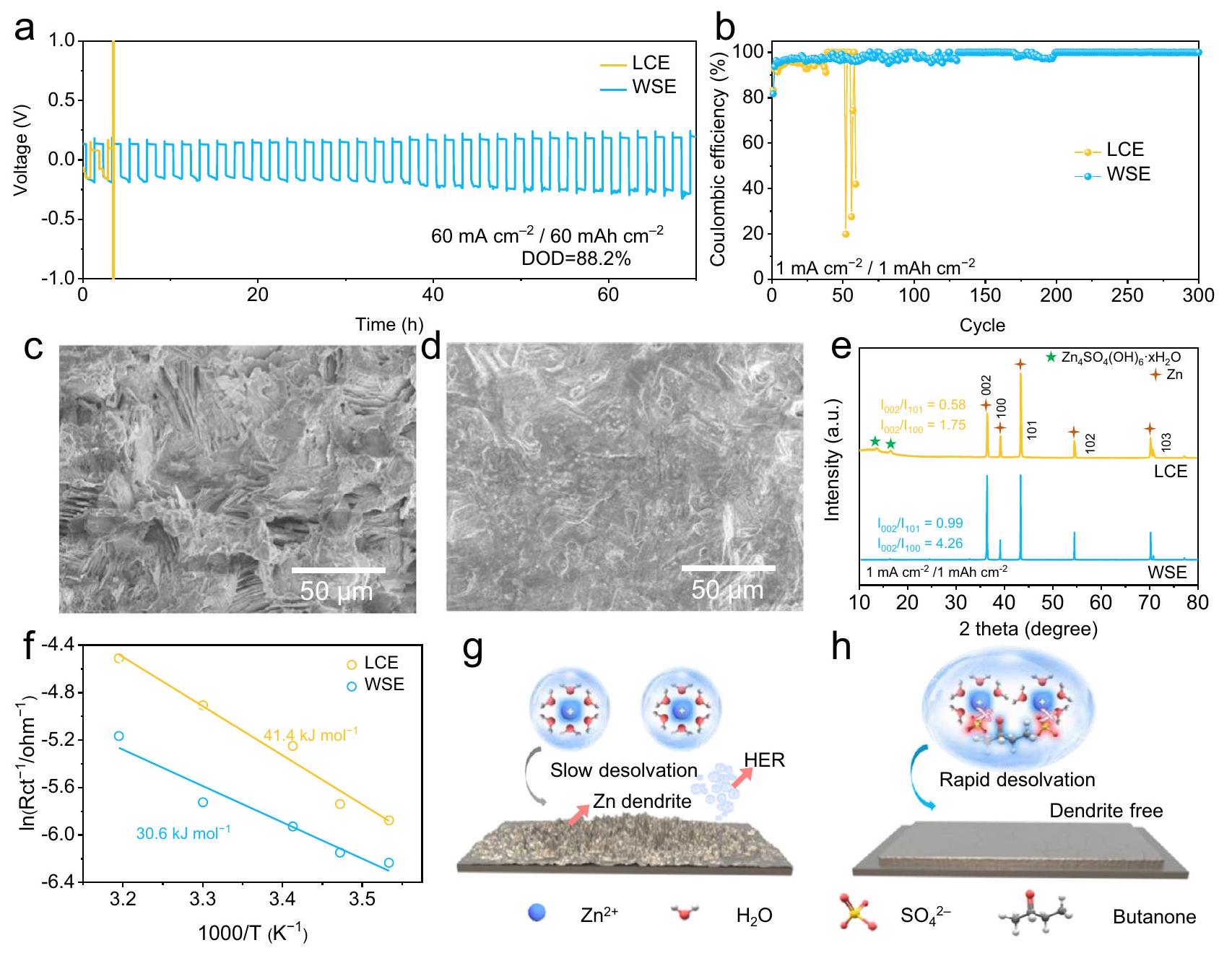 طريقة أكثر أساسية لتقليل عدد المحلولاتهو من خلال إضعاف القدرة الذاتية على الذوبان لـالعوامل الرئيسية التي تقيم قدرة المذيب على الحل هي الثابت الكهربائي. و يصف القوة الكهروستاتيكية بين الأيونات المذابة وDN يؤثر على سلوك النيوكليوفيل للمذيب. بالنظر إلىمع كبير (80.4) و DN (18) هو المذيب السائد في AZIBs ويظهر قدرة عالية على إذابة أملاح الزنك، يُفترض أن قوة الإذابة لـيمكن أن تكون محدودة بواسطة إضافات منخفضة و DN. هنا، نقوم بصياغة إلكتروليت ضعيف الذوبان (WSE) من خلال إدخال منخفض و DN بيوتانون كمضاف إلى 0.5 م لبناء بطاريات AZIB طويلة العمر. تشير التجارب والمحاكاة النظرية إلى أن WSE يمكن أن (i) تقلل من عدد الجزيئات المذابةوتثبط التفاعلات الجانبية على أنود الزنك. (ii) تعزز حركية إزالة الحلول منوكذلك قمع نمو الشجيرات بالإضافة إلى تلاشي هيكل مواد الكاثود. نظرًا لـوالأنيونات تتنافس لدخول غلاف الإذابة لـ، مما يقلل من عدد الجزيئات المذابةيمكن أن يمكّن المزيد من الأنيونات من دخول غلاف الاستحلاب لـتشكيل هيكل حل مائي فقير. خلال الـعملية الترسيب على أنود الزنك أوعملية الإدخال على الكاثود، فإن سطح القطب السالب المشحون لديه تنافر كهربائي مع الأنيون في غلاف الترطيب لـ، مما يساعد على تسريع حركيات إزالة الذوبان لـوتعزيز الانتشار الموحد لـ (الشكل 1أ). وبالتالي، يظهر تكرار أنود الزنك في WSE استقرارًا استثنائيًا عند كثافة تيار عالية للغاية، وسعة سطحية، وعمق تفريغ.، و ). ثلاثة AZIBs تمثيلية بما في ذلك (NVO)، ، و تم تجميع خلايا باستخدام WSE وتظهر استقرارًا ممتازًا في الدورة. والأكثر تشجيعًا، تم تصنيع بطاريات AZIBs من نوع AA القابلة لإعادة الشحن، والتي يمكن أن توفر سعة عالية تبلغ 101.7 مللي أمبير ساعة واستقرارًا رائعًا.احتفاظ السعة بعد 30 دورة عند 0.66 C.