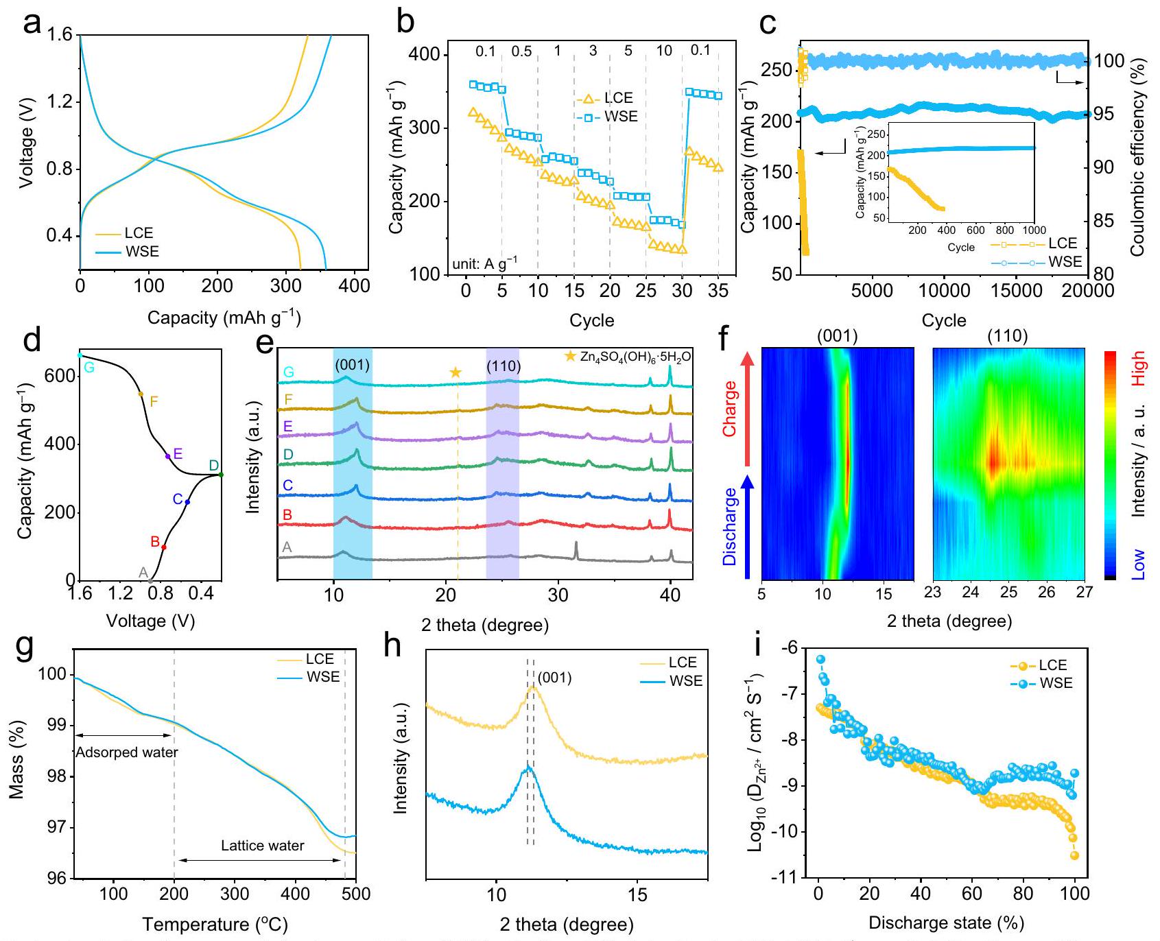 التم فهم عملية الترسيب بشكل أفضل من خلال تقنيات التحليل الكهروكيميائي. طاقة التنشيط ( ) لسرعة التجفيف لـ تمت مقارنة أيونات بناءً على معادلة أرهينيوس في إلكتروليتات مختلفة في الشكل 2f.القيم هي 41.4 وفي إلكتروليتات LCE و WSE، على التوالي، مما يشير إلى انخفاض حاجز طاقة إزالة الحلول في WSE، والذي يرجع إلى هيكل الحلول الفريد من نوع الأنيون.في WSE الذي يسهل عملية إزالة الذوبان من خلال تأثير التنافر الكهروستاتيكي مع أنود الزنك الموجب القطبية.بفضل تحسين حركيات إزالة الذوبان لـفي WSE، يتم تعزيز خطوة النواة الإضافية للزنك أيضًا. كما هو موضح في الشكل التوضيحي 18، فإن جهد النواة للقطب الزنك في WSE أقل من ذلك في LCE عبر مجموعة من كثافات التيار. )، وهو مفيد للنمو المت uniform للودائع Zn. لذلك، يمكن أن يُعزى الاستقرار المعزز لقطب الزنك في WSE إلى: (i) بيئة فقيرة بالماء تتشكل بنية الحل في WSE التي تقمع تآكل HER والتفاعلات الجانبية الأخرى؛ (ii) مثل هذه البنية الحل.مفيد للصيامالهجرة و