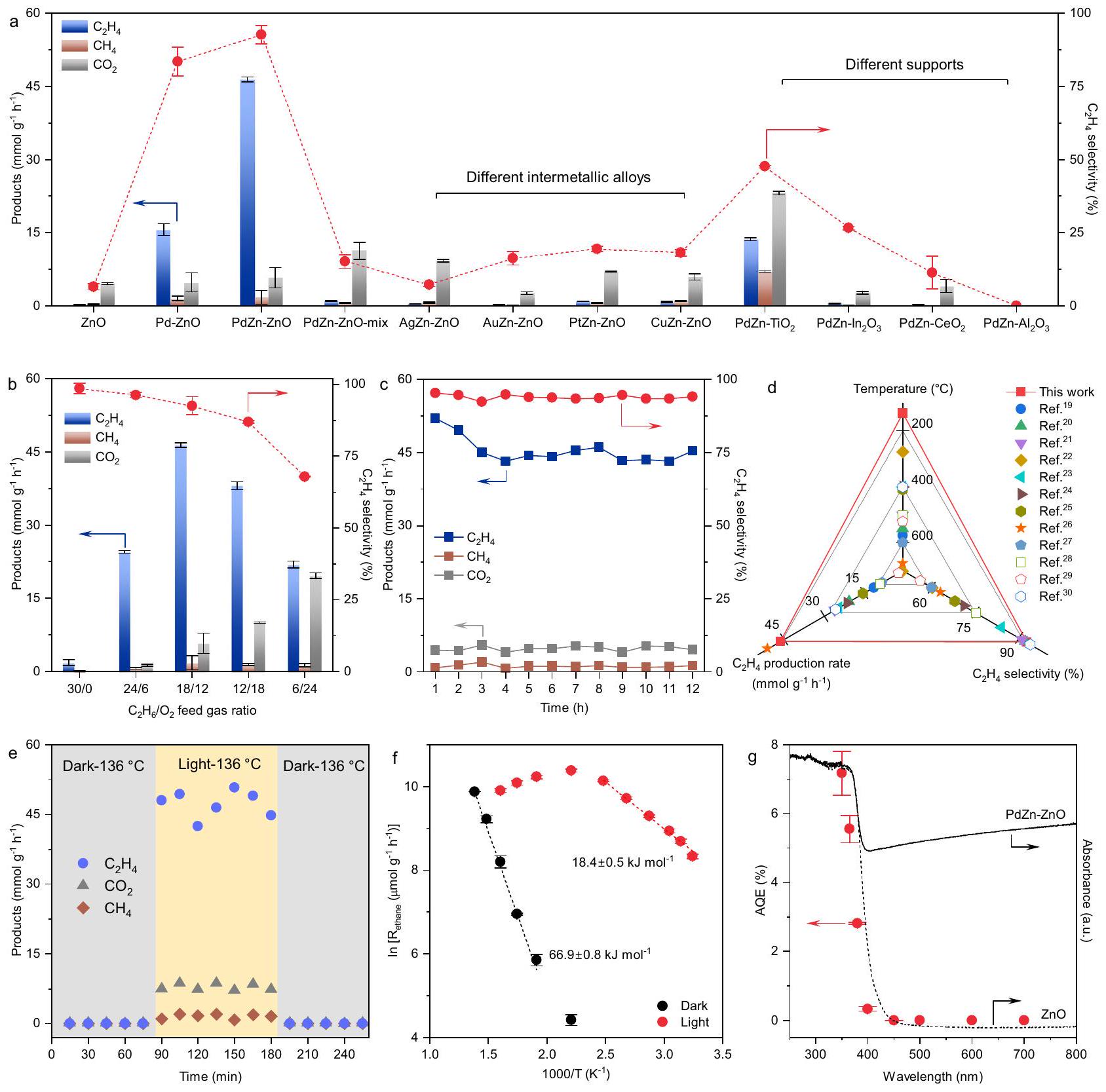 Photocatalytic ODHE tests were carried out using a home-made continuous flow photoreactor equipped with a 365 nm LED lamp as the light source (see Methods for experimental details). A mixture of ( in ) and in with a total flow rate of was introduced as the feed gas. Figure 2a and Supplementary Table 2 show the photocatalytic production rate and selectivity for and a series of reference samples. PdZn-ZnO exhibited a production rate of with an ethylene selectivity of . No liquid carbon-containing products, such as methanol and ethanol, were formed during the photocatalytic reaction (Supplementary Fig. 8). The optimal photocatalyst dosage and nominal Pd loading were determined to be 5.0 mg and , respectively (Supplementary Fig. 9 to 11). The calcination temperature of the precursor was optimized to be (Supplementary Fig. 12 and 13). The reference delivered a production rate of with ethylene selectivity, which is significantly lower than . It should be noted that for pristine ZnO , only and traces of were generated, with no obvious enhancement observed for a physical mixture of ZnO with PdZn nanoparticles (denoted as PdZn-ZnO-mix, Supplementary Fig. 14). We also prepared other intermetallic nanoparticles (AgZn, AuZn, PtZn, CuZn) supported on ZnO (denoted as and Cu ) using methods similar to that used to prepare (Supplementary Fig. 15). However, was the major product for all these photocatalysts. In addition, catalysts containing PdZn nanoparticles on other metal oxide supports, including , and were prepared (Supplementary Fig. 16). prefer to over-oxidize to with a low selectivity of . PdZn- , and PdZn showed negligible activity under the same reaction conditions. Clearly, the ZnO support actively participated in photocatalytic ODHE over . Above results indicated that PdZn intermetallic nanoparticles, ZnO , and the interfacial contact between PdZn and ZnO were indispensable to the outstanding photocatalytic performance.