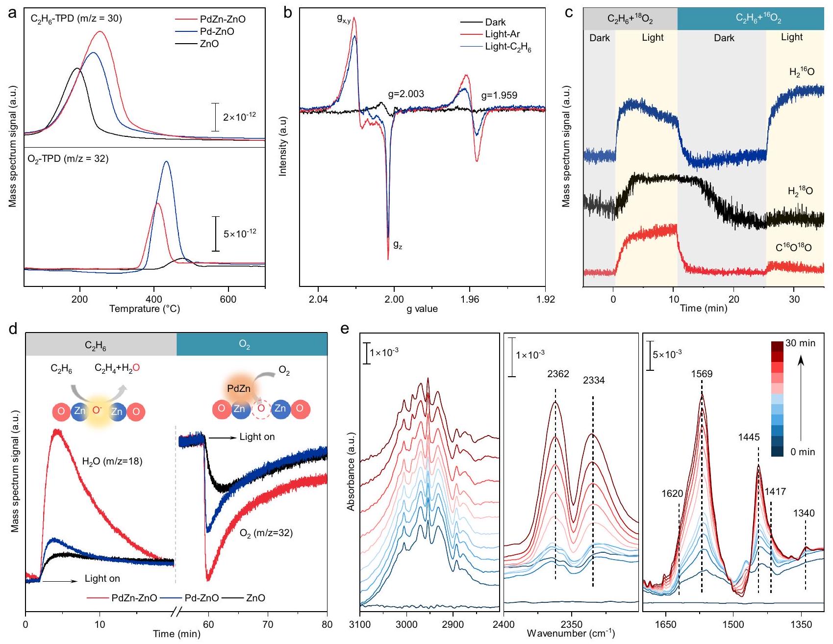 and two reference samples, ZnO and , were selected for further mechanistic investigations. Firstly, temperatureprogrammed desorption experiments for and -TPD and -TPD) were conducted, with the results shown in Fig. 3a. The data show that desorbed at and on , and , respectively. Clearly, shows a higher desorption temperature than the other samples, indicating a strong chemical adsorption towards . Furthermore, demonstrates the highest ethane adsorption strength when compared to , and (Supplementary Fig. 29). This heightened ethane adsorption capability could be a key factor contributing to the significantly improved photocatalytic ODHE performance observed in compared to its counterparts. In the -TPD profiles, desorption signals were observed between 400 and for all three samples, which can be ascribed to the desorption of chemisorbed oxygen species. The adsorption capacity of pristine ZnO was modest, and largely attributable to adsorption/dissociation on oxygen defects produced by sample pretreatment in a hydrogen atmosphere . Once Pd or PdZn nanoparticles were introduced, the amount of adsorbed oxygen increased significantly, indicating that Pd and PdZn were the dominant active sites for adsorption and activation .