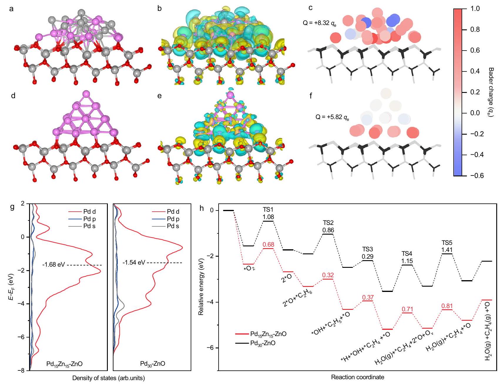 للحصول على فهم أفضل لعمليات نقل الإلكترون وحالات الانتقال التفاعلية (TS) التي تحدث عند الواجهة بين الجسيمات النانوية المعدنية (PdZn أو Pd) ودعم ZnO، تم إجراء حسابات نظرية الكثافة الوظيفية (DFT). تم بناء نموذجين وتحسينهما لمحاكاة هيكل و . أعنقود مدعوم على (المشار إليه بـ ) تم استخدامه لتمثيل بينماعنقود مدعوم على (المشار إليه بـ ) تم استخدامه لتمثيل كما هو موضح في الشكل 4a و 4d. أظهر مقارنة فرق كثافة الشحنة بين النموذجين أن إعادة توزيع الشحنة محلية في منطقة محدودة بالقرب من الواجهة بين جزيئات المعدن النانوية ودعامات ZnO (الشكل 4b و 4e). توقع تحليل شحنة بادير زيادة تراكم الشحنة ( ) على الـ العنقود (الشكل 4ج) مقارنة بـعنقود (، الشكل 4f)، مما يشير إلى أن نقل الإلكترونات من PdZn إلى ZnO قد زاد مقارنة بنقل الإلكترونات من Pd إلى ZnO. إن الطاقة المرتبطة الأعلى لإشارة Pd 3d فيمنكما يدل على حالة نقص الإلكترون بشكل أكثر وضوحًا المرتبطة بنقل الإلكترون على الواجهة (الشكل التكميلي 35). أظهرت حسابات DFT أيضًا أن هناك تشتت ونقل قوي للإلكترونات على الواجهة فيأسفر عن موضع مركز حزمة Pd d-band أكثر سلبية (-1.68 eV) مقارنة بـالشكل 4 جإن مركز حزمة d السلبية أكثر في حالة PdZn المدعوم يساهم في حالة مضادة للرابطة منخفضة الطاقة لم adsorbates الأكسجين، مما يؤدي إلى زيادة شغل مدارات d وضعف طاقة الامتصاص للـ adsorbates الأكسجين النشطة.. كان من المتوقع أن يكون هذا مفيدًا لعمليات تجديد الأكسجين الشبكي اللاحقة على ZnO المجاورة خلال ODHE.