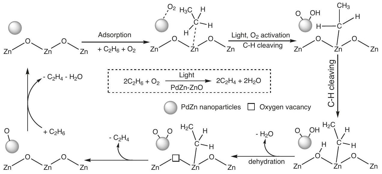 In summary, we report the first example of selective photocatalytic ODHE with for ethylene production. A PdZn-ZnO photocatalyst, containing PdZn intermetallic nanoparticles, was prepared via thermal hydrogen reduction of a Pd-doped precursor. The strong electron transfer interactions at the interface promotes the photogeneration of surface active sites on ZnO to activate the bonds in ethane, leading to the formation of ethylene and water. Photo-excited electron transfer from ZnO to PdZn facilitated dioxygen dissociation, allowing fast replenishment of ZnO lattice oxygen consumed in the Mars-van Krevelen mechanism.