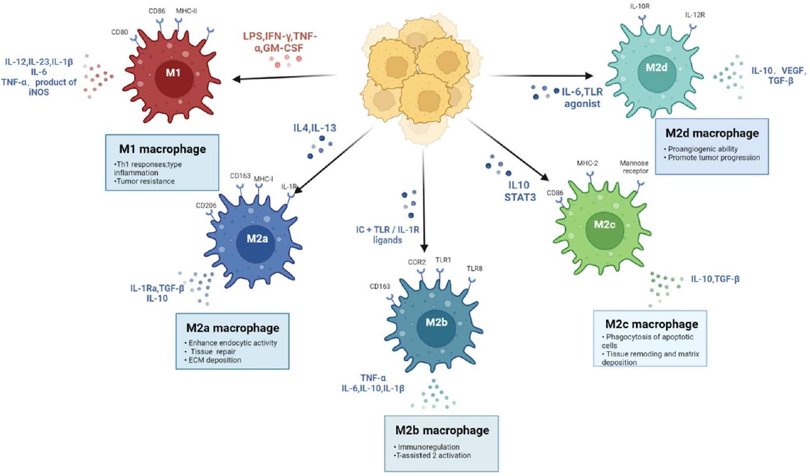 إنتاج مستويات منخفضة من IL-12 وiNOS. تتمتع هاتان المجموعتان من البلعميات بخصائص ظاهرة ووظيفية مختلفة. ومع ذلك، اعتماداً على المؤثرات المضادة للالتهاب المستخدمة في المختبر لتوليد بلعميات M2، قد تظهر هذه الخلايا تغييرات ظاهرة دقيقة [28]. تم تصنيف بلعميات M2 بشكل إضافي إلى أربعة أنماط فرعية نشطة بالتناوب (M2a، M2b، M2c، وM2d) بناءً على التمييز الوظيفي، وكلها تدعم تجديد الأنسجة وإصلاح الجروح. تحت تأثير IL-4 أو IL-13، تفرز بلعميات M2a بشكل رئيسي سيتوكينات مثل IL-1Ra، وTGF-