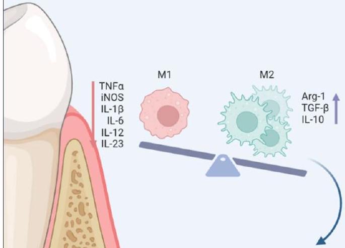 وتقليل الالتهاب. أظهرت الأبحاث أن تنشيط M2 يوقف فقدان العظام [9، 10]. يمكن أن تؤدي حقن M2 في الأنسجة اللثوية إلى قمع نشاط الخلايا العظمية وتقليل أعراض التهاب اللثة [11]. لذلك، قد تتضمن طريقة جديدة لعلاج التهاب اللثة تعزيز تحويل M1/M2 أو الحد من التأثيرات المؤيدة للالتهاب لـ M1 اللثوي.