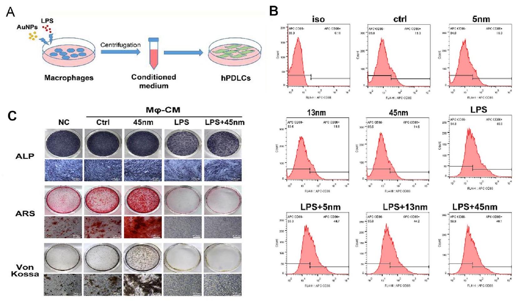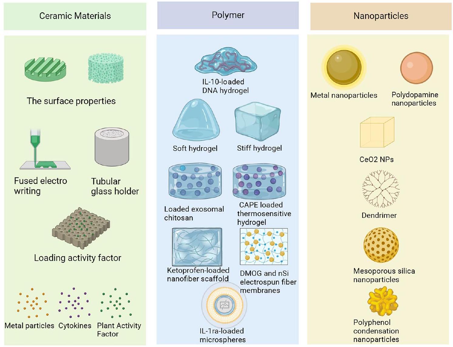 على الرغم من أن البلعميات قد تم تقديمها كهدف جديد في علاج التهاب اللثة، إلا أن معظم الأدوية لا تزال تعاني من مشكلات مثل عدم استقرار التأثيرات، والنشاط غير المنتظم، ونقص التخصص المستهدف [12]. لقد حظيت المواد الحيوية التي تعدل وظيفة المناعة للبلعميات باهتمام بحثي متزايد لأنها يمكن أن تعالج قيود الأدوية الحرة وحدها من خلال التصميم المدروس. يتم علاج التهاب اللثة بطريقة تدريجية، وبعد المرحلة غير الجراحية، قد تكون العيوب داخل العظام أو التفرع قابلة للجراحة التجديدية. تشمل المواد الحيوية المتاحة في العلاج البيولوجيات (تركيزات الصفائح الدموية الذاتية، الهلاميات، الجسيمات النانوية)، وزرع العظام (زرع عظام نقي أو سيراميك)، والأغشية (بوليمرات) المشاركة في علاج التهاب اللثة المساعد، واستعادة الأنسجة العظمية التجديدية، وتجديد الأنسجة الموجهة [13]. تعتبر المواد السيراميكية، والبوليمرات، والجسيمات النانوية الأنواع الرئيسية من المواد الحيوية التي تنظم بلعميات التهاب اللثة. من خلال الخصائص الفيزيائية والفيزيولوجية الفطرية للمادة أو عن طريق إضافة مكونات نشطة مثل الأدوية، وأيونات المعادن، والسيتوكينات، والإكسوزومات، وما إلى ذلك، يمكن للمواد الحيوية التحكم في حالة ونشاط البلعميات [14].