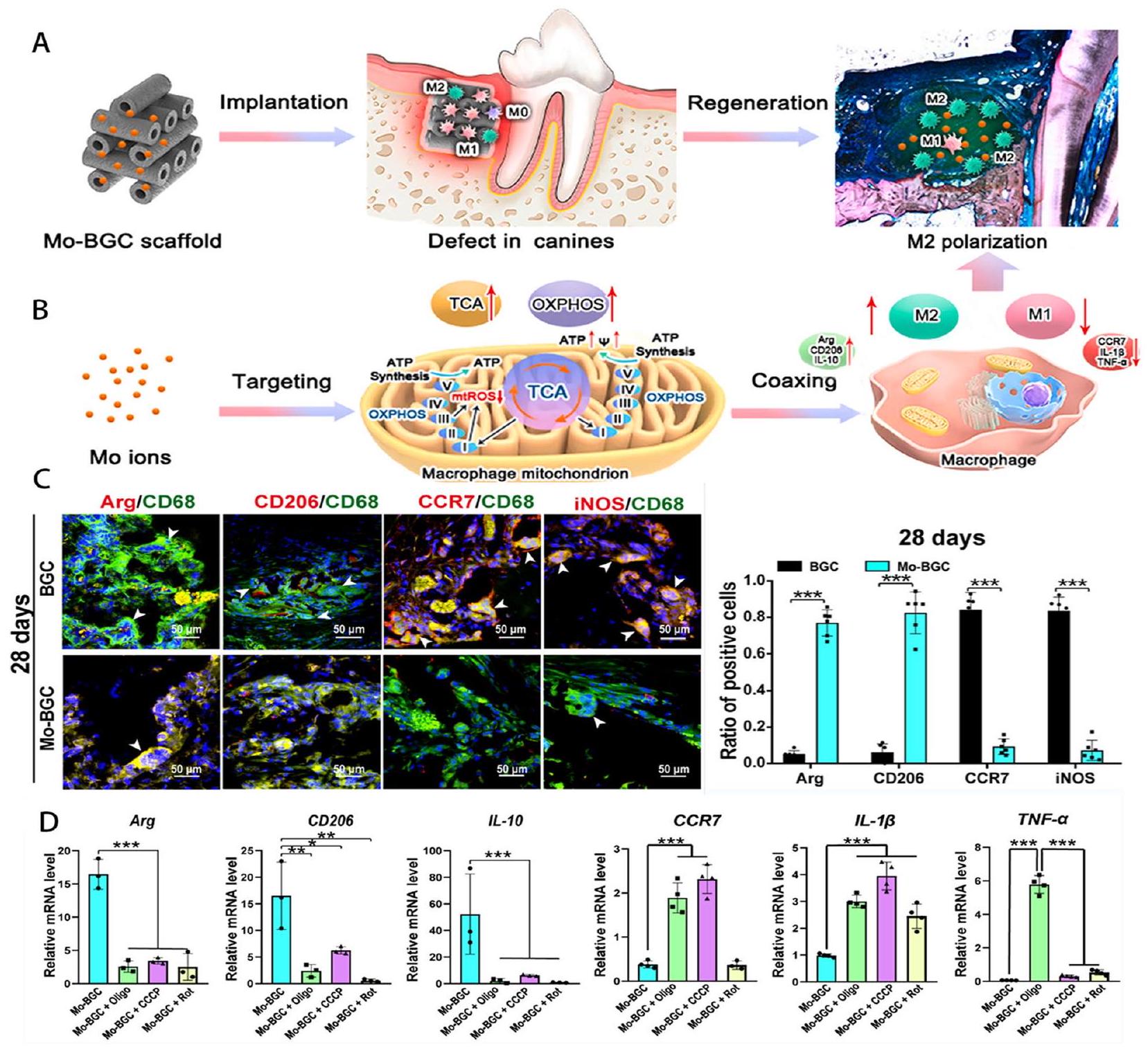 | Incorporating bioactive factors | Metallic particles | Molybdenum-containing bioactive glass-ceramic (Mo-BGC) scaffolds induce M2 polarization by enhancing mitochondrial function in macrophages | [92] |