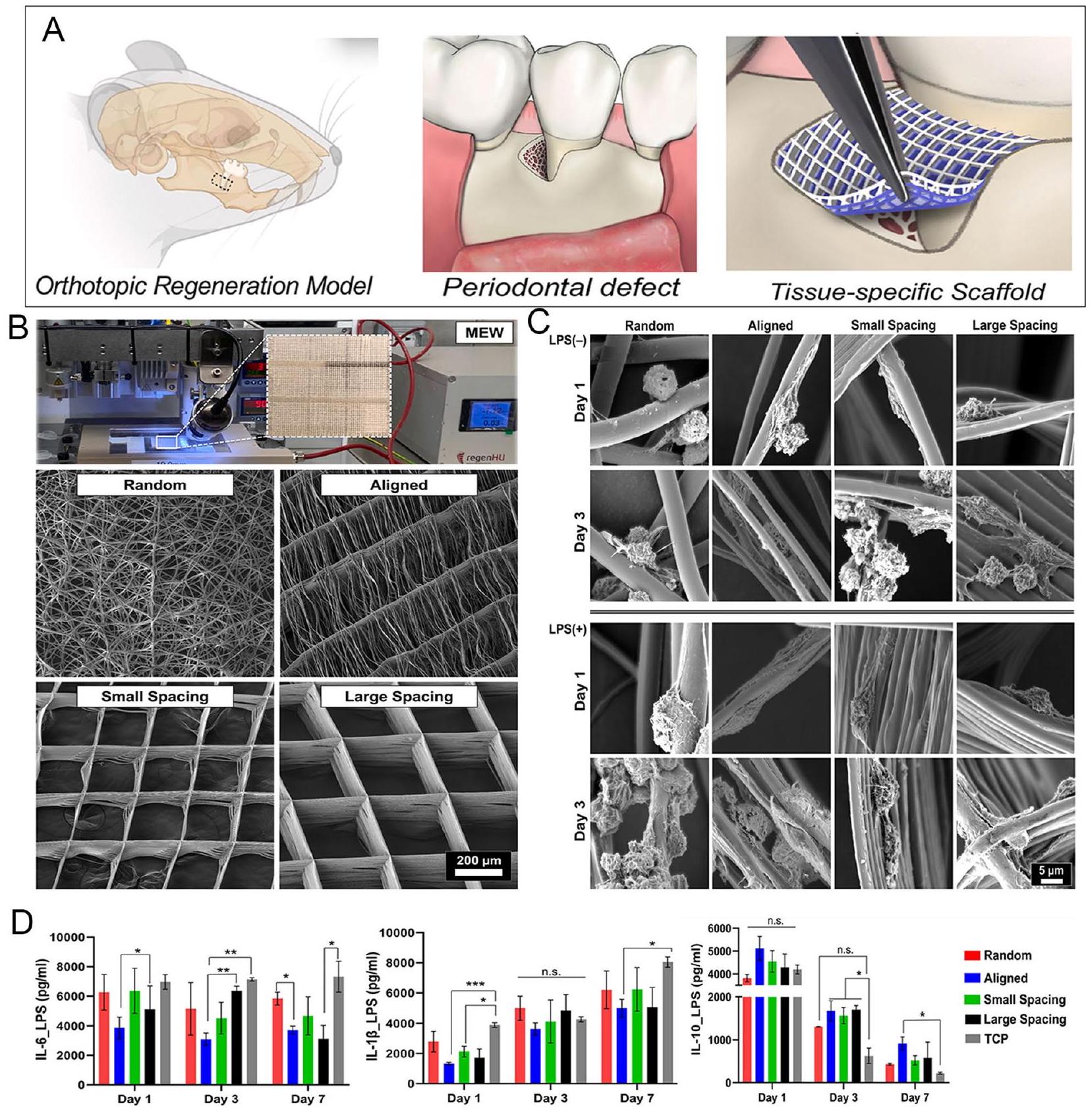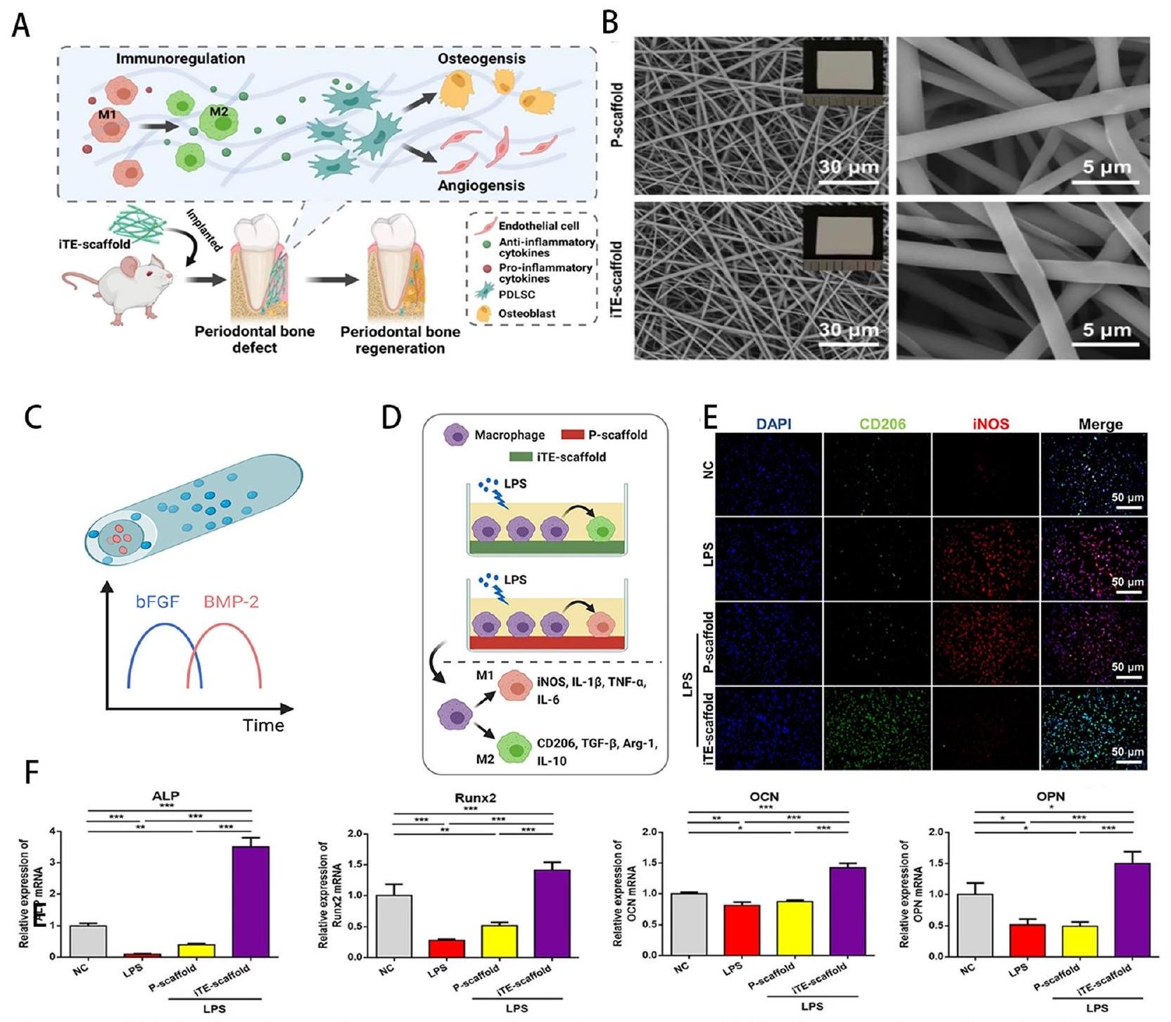 يمكن أن تعزز دمج الأدوية والسيتوكينات القدرة المناعية للبوليمرات الموجودة. البوليمر غير السام المستخدم على نطاق واسع المعروف باسم بولي (حمض اللاكتيك) (PLLA) وبولي (حمض اللاكتيك-حمض الجليكوليك) (PLGA) له توافق حيوي جيد وخصائص نقل الأدوية. قام تشاتشليوتاكي وآخرون [102] بتطوير هيكل نانوي مركب يتكون من بروتين لاصق من الحرير وPLGA ووكيل مضاد للالتهابات هو كيتوبروفين. وقد أظهر أن الهيكل المركب كان له زيادة في المحبة للماء وخصائص ميكانيكية محسنة بشكل كبير مقارنة بهيكل PLGA العادي، وأنه يمكن أن يوفر تأثيرات مضادة للالتهابات مستدامة في علاج أمراض اللثة مع وقت إطلاق دواء يصل إلى 15 يومًا. بالإضافة إلى ذلك، أظهرت الخلايا الليفية اللثوية ارتباطًا جيدًا وتكاثرًا على الهيكل. كشفت دراسة إضافية أن MMP-9 وMMP-3 كانت منخفضة بشكل كبير وأن تعبير IL-10 كان مرتفعًا في البلعميات بعد الثقافة على الهياكل. طور ليو وآخرون [103] غشاء ألياف كهربائي قائم على PLGA لتحميل ثنائي ميثيل أوكزاليل غليسين (DMOG) ونانو سيليكات (nSi). وقد تم إثبات أنه من خلال التحكم في تحويل النمط الظاهري للبلعميات M2، قد يقلل DMOG وnSi الالتهاب أو يعزز تجديد الأنسجة. من الجدير بالذكر أن دمج ألياف البوليمر ذات معدلات تحلل مختلفة يمكن أن ينظم الإطلاق المتسلسل للسيتوكينات المدمجة فيها، مما يمكّن من تنظيم مرحلي للبلعميات. أنشأ دينغ وآخرون [104] إطار عمل قائم على الألياف بنظام نواة/قشرة قادر على الإطلاق المتسلسل لعامل نمو الخلايا الليفية الأساسي (bFGF) وBMP-2. من الجدير بالذكر أن AuNPs منعت التغيير (الشكل 8). بينما يتحلل PLLA ببطء، يتحلل PLGA بسرعة. إن الإطلاق المتسلسل لـ bFGF وBMP-2 المدمجين فيه ممكن بفضل هذا الاختلاف في معدل التحلل. أظهرت الاختبارات في المختبر أن الهيكل الهندسي للأنسجة في الموقع (iTE scaffold) قد يزيد بشكل كبير من تعبير CD206 ويقلل من إنتاج iNOS، مما يدعم البلعميات في التحول من M1 إلى M2. بالإضافة إلى ذلك، يمكن أن يؤدي استقطاب M2 للبلعميات الناتج عن الهيكل iTE إلى تعزيز تعبير الجينات العظمية في PDLSCs. علاوة على ذلك، يسرع الهيكل iTE من نمو الأوعية الدموية اللثوية. بشكل عام، تعتبر هياكل iTE هياكل هندسية مناسبة لتجديد العظام في التهاب اللثة المتقدم. في الختام، يمكن أن تبدأ الاستراتيجية التنظيمية لألياف البوليمرات على البلعميات من ترتيب الألياف ودمج العوامل النشطة. بالإضافة إلى ذلك، الإطلاق المتسلسل