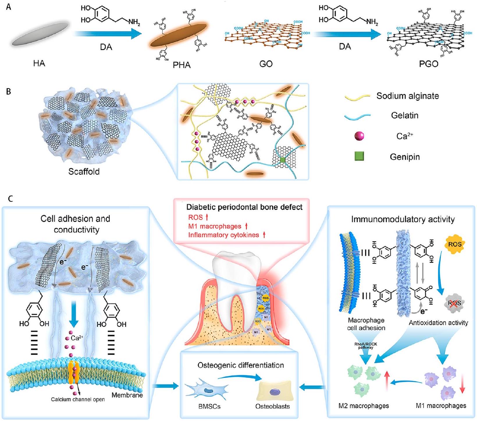 تسريع إعادة بناء العظم السنخي لدى مرضى السكري. أظهرت الدراسات أن الهلام الاصطناعي ILGel قد أطال من زمن الاحتفاظ بـ IL-10 واحتفظ بالنشاط البيولوجي لـ IL-10 لمدة لا تقل عن 7 أيام وعزز من استقطاب البلعميات M2. استنادًا إلى الدراسات السابقة، وجد بينغ وزملاؤه أن دمج الهلاميات الحمض النووي مع الكتل النانوية الفضية (AgNC) والجزئيات خارج الخلوية المستمدة من البلعميات M2 يمكن أن ينظم أيضًا استقطاب البلعميات ويسرع من شفاء العظم السنخي. تشير هذه الدراسات إلى أن دمج الهلاميات الحمض النووي مع مكونات حيوية نشطة أخرى يحمل وعدًا كبيرًا في علاج إصابات العظم السنخي لدى مرضى السكري، والتهاب اللثة، وتنظيم البلعميات.
