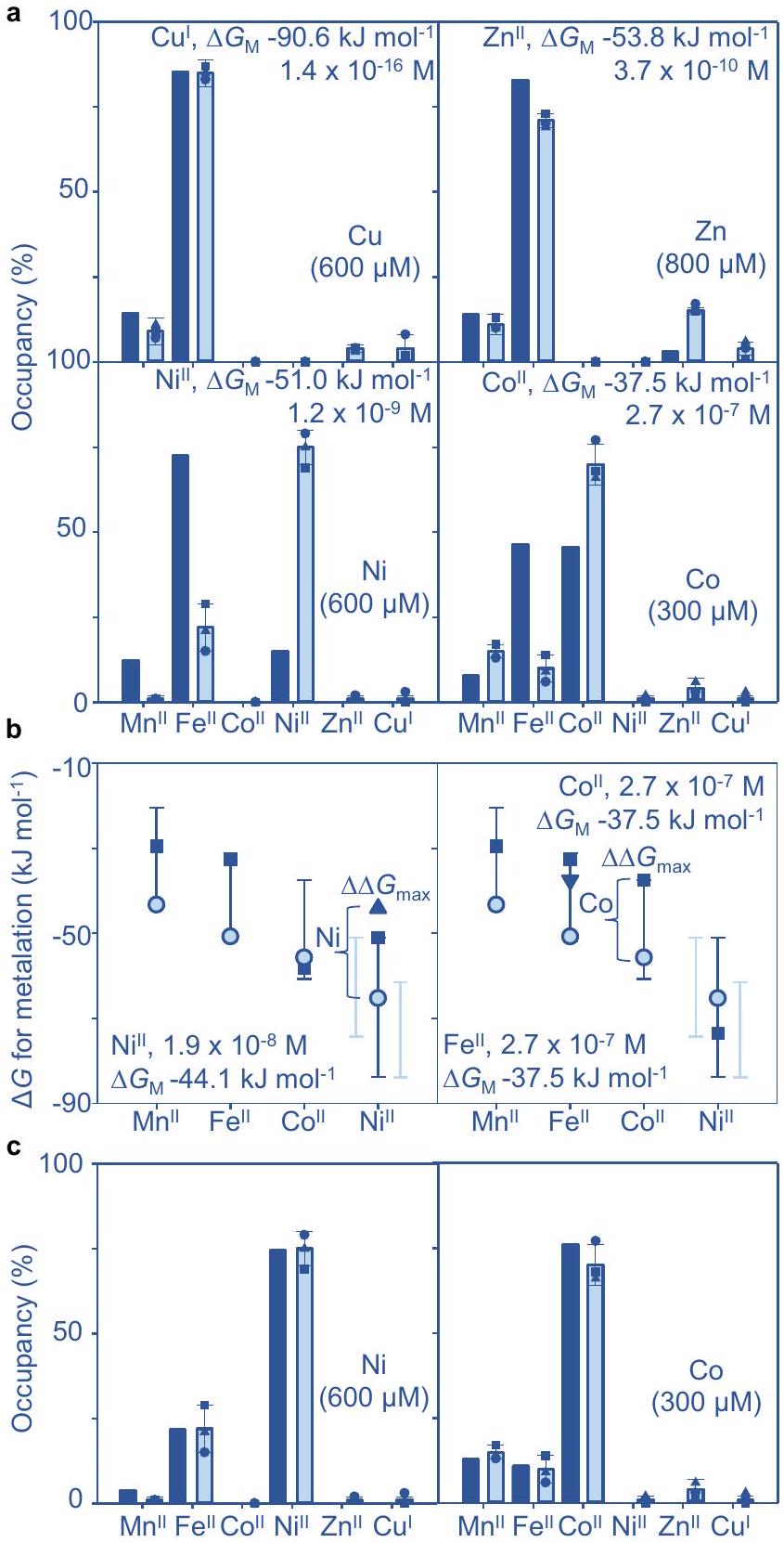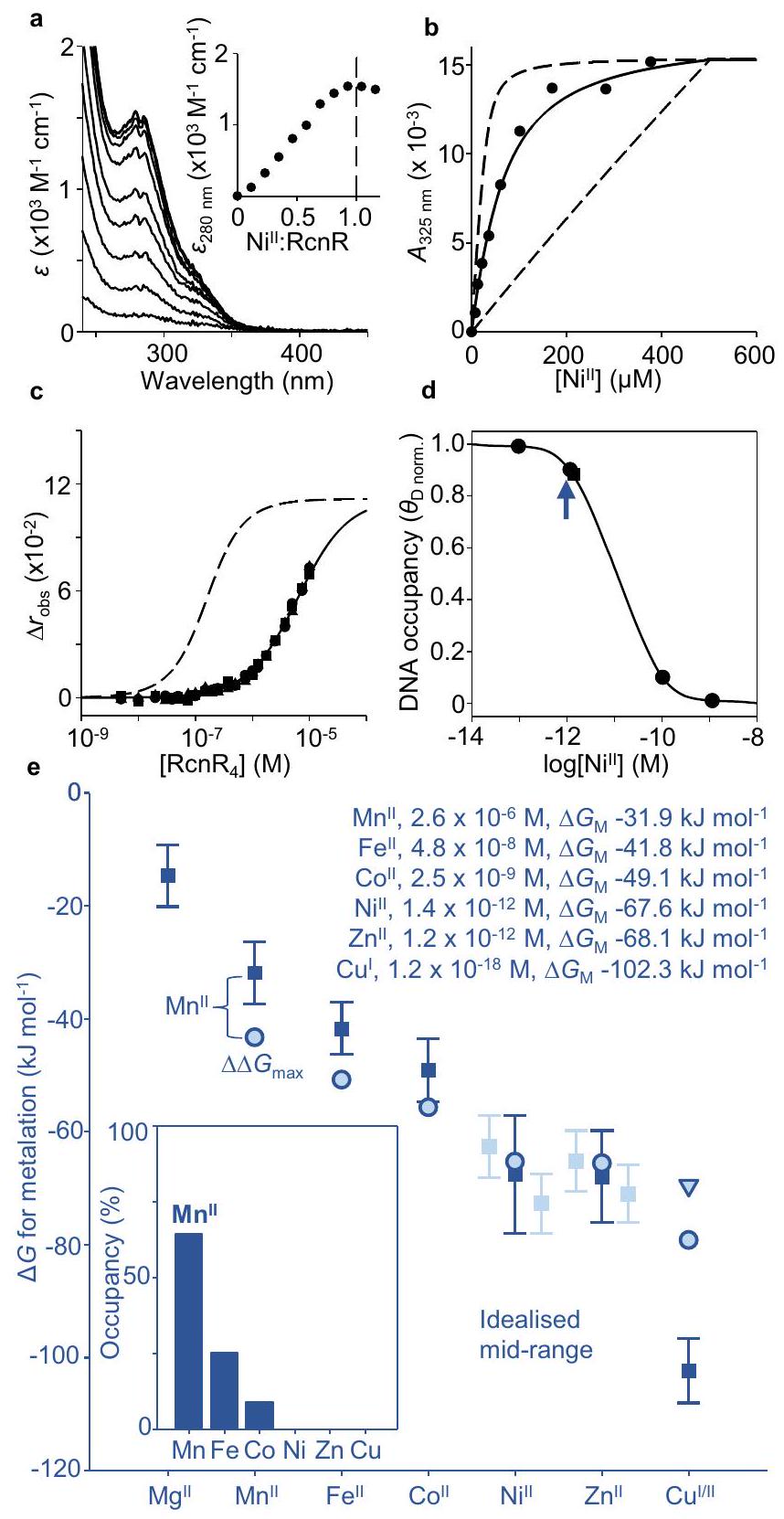تقدم الشكل 1d تفضيلات المعادن لـ MncA بعد أخذ المنافسة من روابط أخرى (NTA أو الهيستيدين) في الاعتبار. يُعتقد أن تصنيف المعادن في البروتينات في السيتوسول المزدحم ناتج أيضًا عن المنافسة مع روابط متنوعة ترتبط بالمعادن القابلة للتبادل والمتاحة بمستويات مختلفة.تم تقدير توافر المعادن في السيتوسول لخلايا البكتيريا (السالمونيلا والإشريكية القولونية) كطاقات حرة ( ): الطاقات الحرة الرسمية لتكوين المركبات مع رافعة نصف معدنية افتراضية عند التوافر المعنيتكتشف حساسات المعادن المرتبطة بالحمض النووي التغيرات فيوقد تم ضبط استجاباتهم لهذه البكتيريا. ومع ذلك، الـاستجابات عاليةتم تجاهل RcnR الحساس سابقًا، ويتطلب معايرته تحديدالألفة زائد الألفة الحمض النووي-RcnR (الشكل التوضيحي 3a).