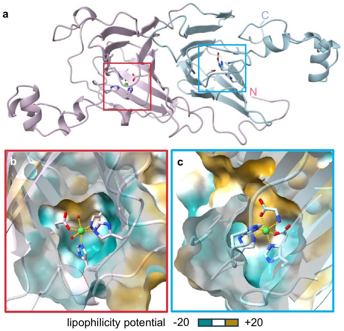 الخصائص المتغيرة للمعادن المرتبطة بالبروتين تخلق تحديًا لتعريف حالات التمثيل المعدني للبروتينات المعدنية داخل الخلايا. يمكن فقدان المعادن أو اكتسابها أو تبادلها عند تحلل الخلايا و/أو أثناء التنقية والتحليل. يعتبر MncA جذابًا لأنيصبح محاصرًا في البروتين المطوي. ومع ذلك، قد يتبنى MncA طيات غير أصلية مع معادن غير متوافقة. قد لا تكون المعادن المنسقة بشكل غير طبيعي محاصر حركيًا.غالبًا ما يفضل الهندسات المسطحة ذات الأربعة تنسيقات، وتم اختيارها للتحليل الهيكلي. هيكل بلوري لـ ( القرار، الجدول التكميلي 3، الشكل التكميلي 6أ)، يظهر طية البي-كوبين لـمع ذرة معدنية في كل مجال كوبين (الشكل 3أ). كل الذرة مرتبطة بثلاثة بقايا هيستيدين وبقايا واحدة من الغلوتامات مع روابط غير بروتينية تكمل التنسيق السداسي.مجالات التنسيق.-MncA لديه بيئات تنسيق مشابهة بدون قناة إلى الطرف الأمينيوقناة ضيقة إلى الموقع الطرفي الكربوكسي مشابهة لـ (الشكل 3ب، ج) من المفترض أن القناة تسمح بالوصول إلى الركيزة للتفاعل التحفيزي. تم احتلال موقع الركيزة بشكل مجاني بواسطة الأسيتات في البنية ومع الجلايسين في الحالة المتبلورة-شكل (الشكل التوضيحي الإضافي 6، الشكل 3c). من غير المحتمل أن يسمح القناة الهيدروفوبية الضيقةالتبادل وبالتالي كلاهماتبدو الذرات محاصرة.