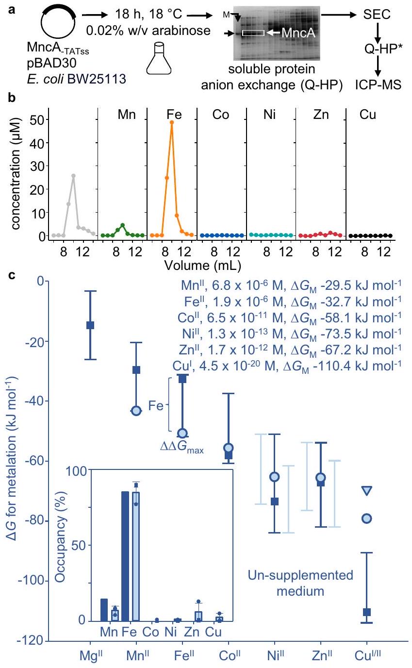 Fig. 4 | Mis-metalation with predicted and observed in heterologous E. coli. a Purification of soluble MncA folded in vivo, minus secretion signal, by anion exchange chromatography ( 5 mL Q-Sepharose, and 1 mL Q-Sepharose) both eluted using high-salt buffer, with intervening SEC (Superdex 200 or 75). MncA was recovered from a soluble protein fraction of . coli after low-level expression overnight at using pBAD30- , induced with arabinose. Representative of biologically independent purifications. Full gel image in Supplementary Fig. 8a. b Representative ( independent biological replicates) chromatogram showing in-cell acquired metals in MncA-containing fractions determined by ICP-MS revealing mis-metalation with and traces of . MncAcontaining fractions were confirmed by SDS-PAGE (Supplementary Fig. 8d) and quantified by (using ). Metal contents of MncA-containing fractions (Supplementary Table 4a, b, Supplementary Fig. 8) were used to calculate fractional occupancies (%). Supplementary Table 4 shows similar outcomes via a modified protocol as used in subsequent experiments. c Metal availabilities ( , squares and text inset) in the cytosol of . coli grown aerobically in LB, estimated as in Foster et al. by calibrated qPCR with genes regulated by cognate metal sensors (bars are sensor ranges from to ). MncA metal-preferences ( , pale blue circles), (triangle). Inset shows occupancies of MncA predicted from the free energy differences using Supplementary Data 4. The inset shows the resulting predicted MncA mis-metalation with (dark blue columns) in the heterologous host based on the largest favourable gradient ( in main figure). Inset also shows mean ( SD) in-cell metalation from the biological replicates (pale blue columns, squares, circles, triangles, Supplementary Table 4b), closely matching predictions. Source data are provided as a Source Data file.