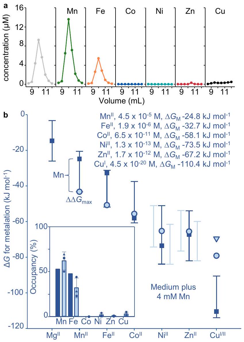 Calibrated transcript abundance in 4 mM manganese reads out intracellular availability of (Supplementary Fig. 4) . This value is shown in Fig. 5b plus availabilities for other metals in un-supplemented media. The largest favourable free energy gradient from exchangeable available metals to MncA becomes (Fig. 5b). Metalation was predicted by substituting this elevated availability into Supplementary Data 4 (inset Fig. 5b). A switch to predominant metalation with cognate plus partial mis-metalation with is thus predicted, as well as observed by MncA -trapping, in . coli supplemented with 4 mM manganese.