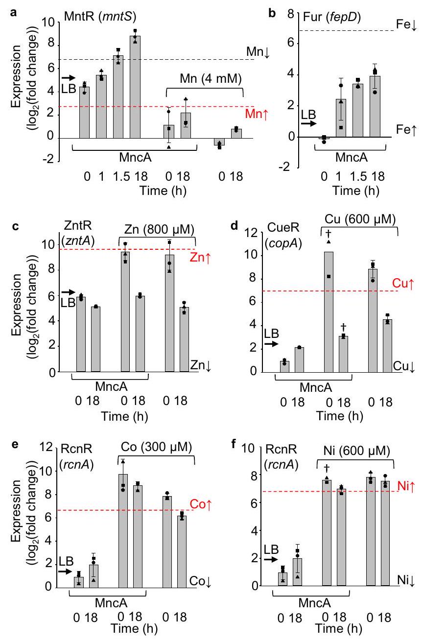 (Fig. 7a, c-f). This is also true for cultures that are not expressing MncA excluding the formal possibility that turnover of metalated MncA sustained elevated steady-state and availabilities but not and . Lack of steady-state elevated and indicates a difference in metallostasis for these metals compared to and . It may be more challenging to metalate proteins in viable cells with or simply by metal supplementation.