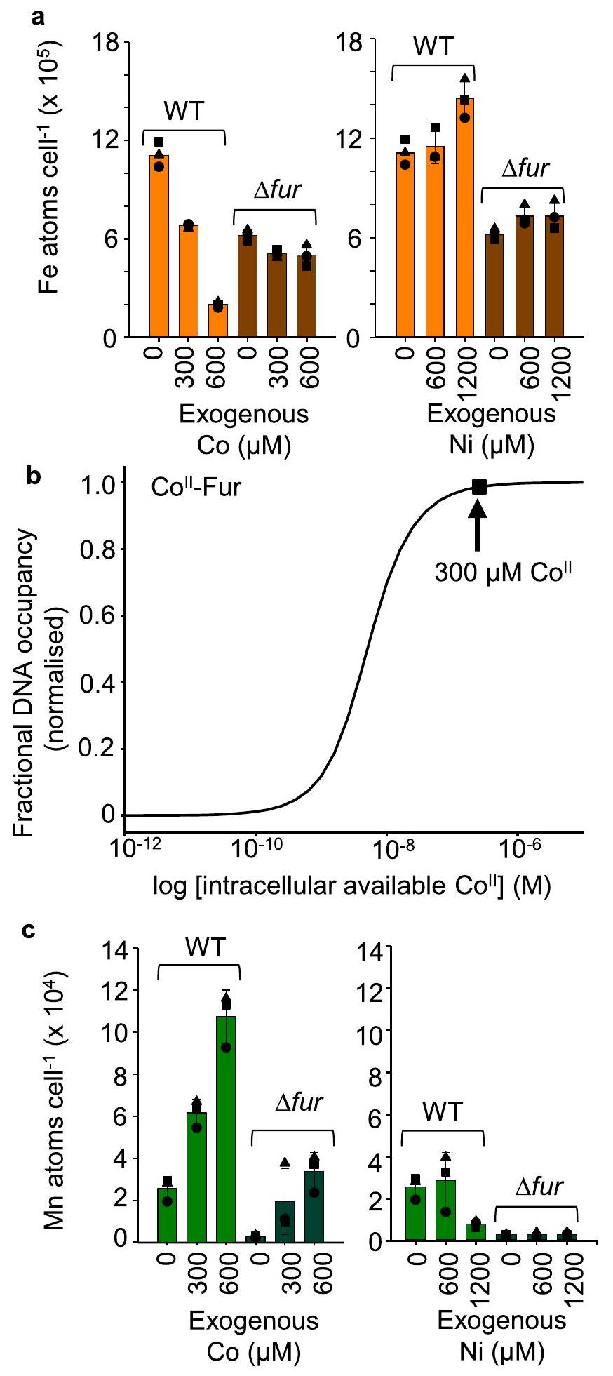 To investigate the MncA-predicted decline in intracellular availability in high (Fig. 6b), total atoms of iron cell were measured by ICP-MS (Fig. 8a). Iron content declined in consistent with the prediction (noting that available metal can sometimes trend differently to total metal). Cells lacking Fur contain less iron in standard media as explained previously . Importantly, the effect of on iron is absent in fur (Fig. 8a). Fur binds and -Fur binds DNA with both affinities already known . Fig. 8b calculates the Fur response to intracellular simulated as for . DNA occupancy at the availability inside cells grown here in elevated cobalt reveals an extreme cross-response of Fur. Non-cognate sensors are known to cross-respond to availabilities at the top of the cognate sensor ranges . Crucially, cross-metalation of Fur with explains the decline in total iron in Fig. 8a and in available intracellular read out by MncA (Fig. 6b).