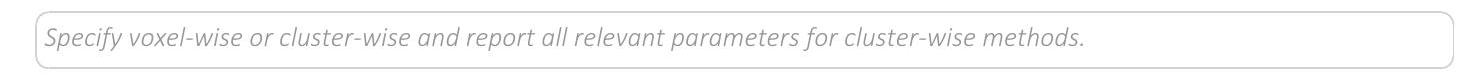 Specify type (mass univariate, multivariate, RSA, predictive, etc.) and describe essential details of the model at the first and second levels (e.g. fixed, random or mixed effects; drift or auto-correlation).