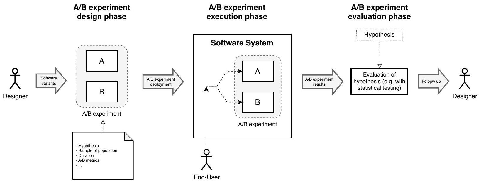 الاختبار هو طريقة يتم من خلالها مقارنة نسختين من البرمجيات، تُعرف النسخة A والنسخة B، من خلال تقييم مزايا النسخ من خلال تعرضها لمستخدمي النظام النهائي 145. لمقارنة النسخ، يتم صياغة فرضية مع تجربة لاختبارها، أي، الفعليةاختبار. على عكس اختبار البرمجيات العادي، يتم إجراء اختبار A/B في الأنظمة الحية. الشكل 1 يوضح العملية العامة لـالاختبار مع ثلاث مراحل رئيسية.