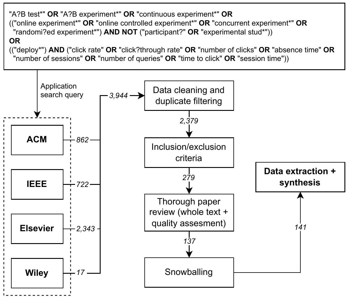 IC3: أوراق مكتوبة باللغة الإنجليزية. لقد حددنا IC1 بحيث ندرج فقط الأعمال التي تتعلق بالأسئلة البحثية المطروحة، أي أنه من الضروري أن تركز الأعمال علىاختبار أو تصميمهم وتقييمهم. لاحظ أن IC1 يتضمن أوراقًا تتناول وتقدم حلولًا للتحديات المعروفة في اختبار A/B. تأكد IC2 من تضمين الأوراق التي تحتوي فقط على بيانات تتعلق بتصميم و/أو تنفيذاختبارات. أخيرًا، قمنا بتضمين الأوراق المكتوبة باللغة الإنجليزية فقط مع IC3.