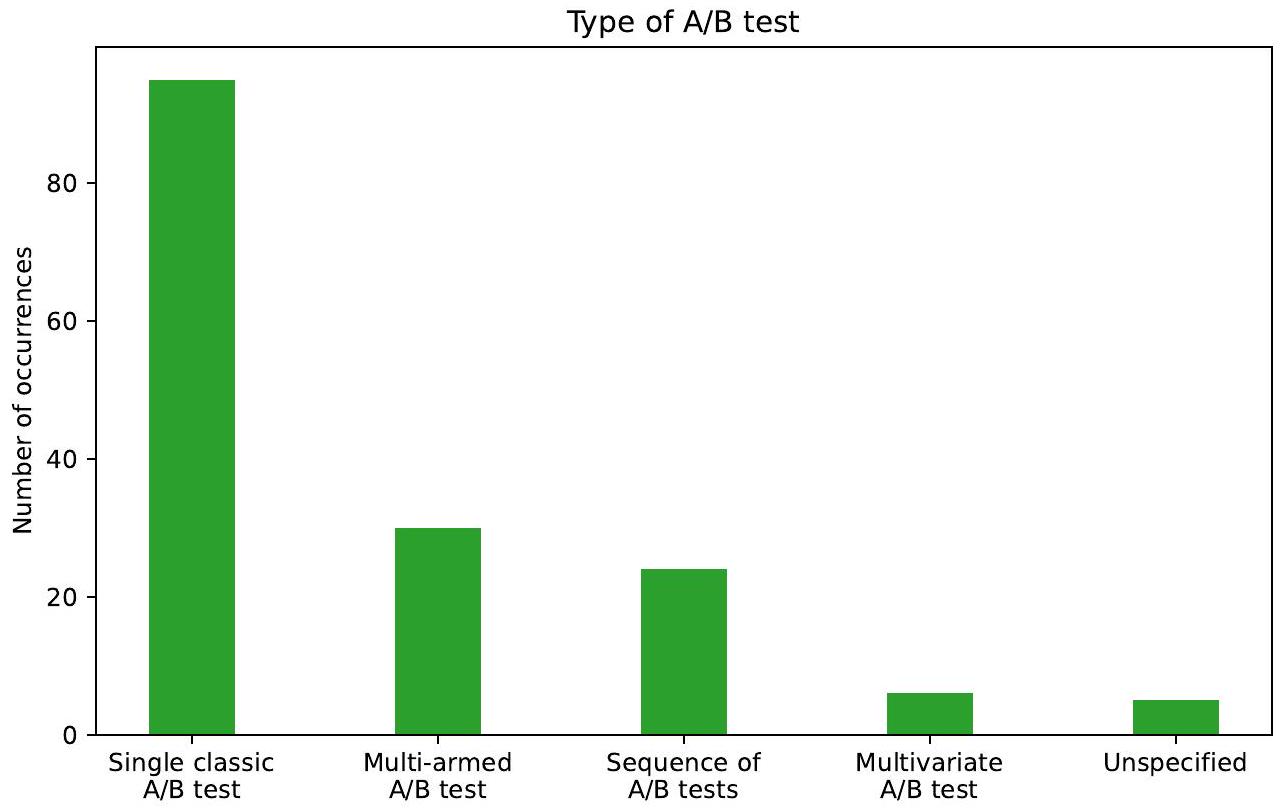 اختبار A/B، المعروف أيضًا بالتجارب المنضبطة عبر الإنترنت أو التجارب المستمرة، هو شكل من أشكال اختبار الفرضيات حيث يتم مقارنة نسختين من برنامج ما في الميدان من وجهة نظر المستخدم النهائي.يتم استخدام الاختبار على نطاق واسع في الممارسة لتمكين اتخاذ القرارات المستندة إلى البيانات في تطوير البرمجيات. بينما استكشفت بعض الدراسات جوانب مختلفة من البحث حولاختبار، لم يتم إجراء دراسة شاملة حول أحدث ما توصلت إليه التكنولوجيا فياختبار. هذه الدراسة ضرورية لتقديم نظرة شاملة ومنهجية على مجالاختبار دفع البحث المستقبلي إلى الأمام. لمعالجة هذه الفجوة وتقديم لمحة عامة عن أحدث التطورات فياختبار، هذه الورقة تقدم نتائج مراجعة منهجية للأدبيات التي قامت بتحليل 141 دراسة أولية. كانت أسئلة البحث تركز على موضوعاختبار، كيفتم تصميم الاختبارات وتنفيذها، وما هي الأدوار التي يلعبها أصحاب المصلحة في هذه العملية، والتحديات المفتوحة في هذا المجال. تُظهر تحليل البيانات المستخرجة أن الأهداف الرئيسية لـاختبار الخوارزميات، العناصر المرئية، وسير العمل والعمليات. كلاسيكي واحدتعتبر الاختبارات هي النوع السائد من الاختبارات، والتي تعتمد بشكل أساسي على اختبارات الفرضيات. لدى أصحاب المصلحة ثلاثة أدوار رئيسية في تصميماختبارات: مصمم المفاهيم، مهندس التجارب، وفني الإعداد. الأنواع الرئيسية من البيانات التي تم جمعها خلال تنفيذالاختبارات هي بيانات المنتج/النظام، بيانات مركزية حول المستخدم، وبيانات مكانية زمنية. الاستخدام السائد لنتائج الاختبارات هو اختيار الميزات، طرح الميزات، تطوير الميزات المستمر، وتصميم الاختبار. لدى أصحاب المصلحة دوران رئيسيان خلالتنفيذ الاختبار: منسق التجربة ومقيم التجربة. المشكلات الرئيسية المبلغ عنها تتعلق بتحسين الأساليب المقترحة وقابليتها للاستخدام. من دراستنا استخلصنا ثلاثة خطوط مثيرة للاهتمام للبحث المستقبلي: تعزيز اعتماد الأساليب الإحصائية فياختبار، تحسين العملية لـاختبار وتعزيز الأتمتة لـاختبار.