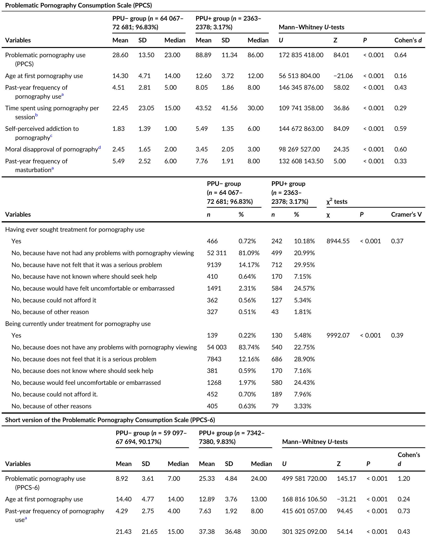 Age at first pornography use | 14.47 | 4.80 | 14.00 | 13.19 | 3.98 | 13.00 | 272751680.00 | -32.14 | < 0.001 | 0.25 | |||||||