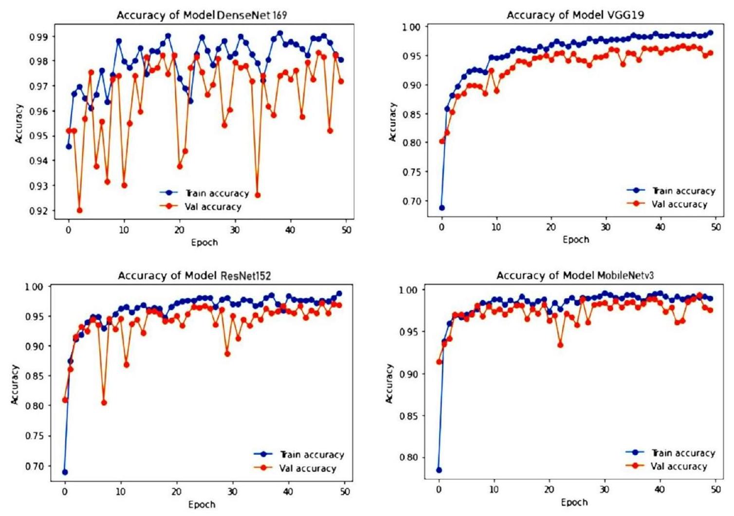 (2) لإجراء مقارنة ذات مغزى، أنشأنا معيارًا يمكن من خلاله تقييم منهجيات التعلم بالنقل المقترحة لدينا مقارنةً بالأبحاث السابقة. النتيجة الرئيسية لدراستنا هي تحقيق أقصى دقة. أظهر MobileNetv3 دقة استثنائية قدرها