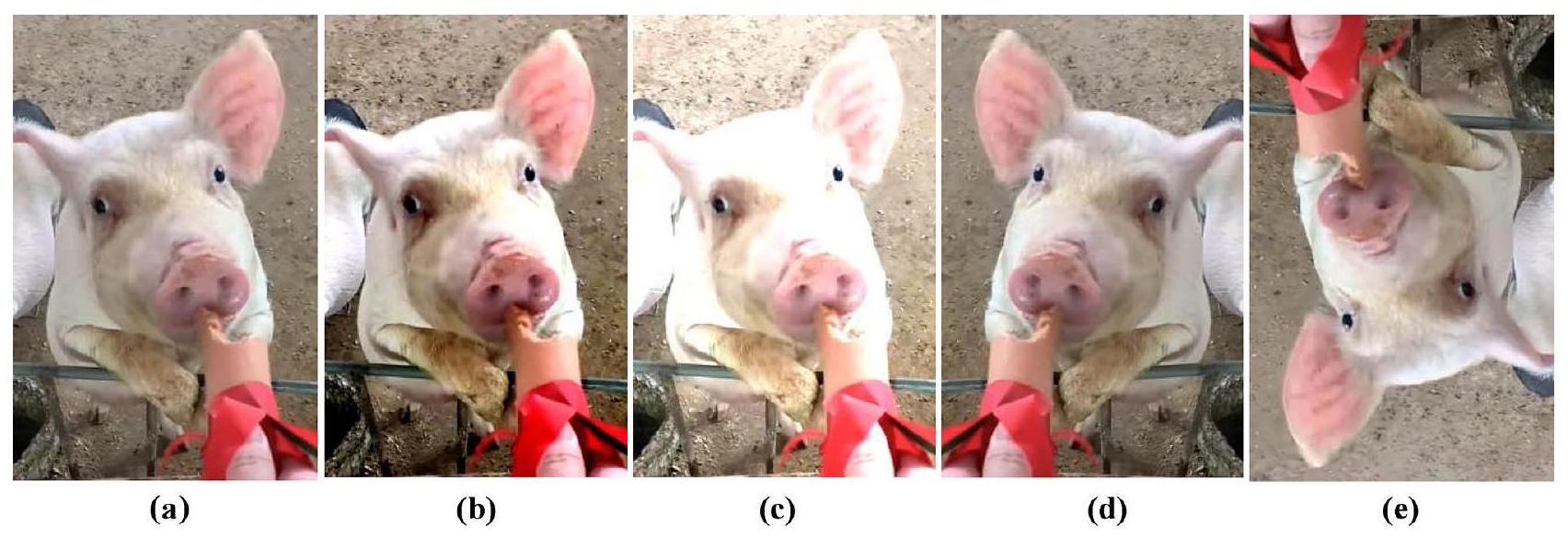 قبل توسيع مجموعة البيانات، خضعت المجموعة الأولية من الصور لسلسلة من خطوات المعالجة المسبقة لضمان التناسق وتعزيز الجودة للتدريب. تم تغيير حجم جميع الصور إلى دقة قياسية، مما يضمن التوحيد عبر مجموعة البيانات. علاوة على ذلك، تم تطبيق أي تقنيات تقليل الضوضاء أو التطبيع، مما أعد الصور لخطوات التعزيز اللاحقة. بالنسبة لتعزيز البيانات، يتم استخدام طرق التحويل الهندسي مثل التدوير، والانعكاس، والقص، وما إلى ذلك، وطرق تحويل البكسل مثل ضبط تباين HSV، والسطوع، والتشبع، وما إلى ذلك. من خلال تطبيق عمليات مثل تعزيز التباين (الشكل 3ب)، وتعزيز السطوع (الشكل 3ج)، وعمليات الانعكاس (الشكل 3د)، وتدوير الزاوية (الشكل 3هـ) على صور التدريب (الشكل 3أ)، يمكن الحصول على شبكة ذات قدرة تعميم أقوى. يساعد ذلك في تقليل الإفراط في التكيف ويوسع حجم مجموعة البيانات. بعد التعزيز، زاد حجم مجموعة البيانات إلى 5400 صورة. لتسهيل التعرف الفعال على تعبيرات الخنازير، تم استخدام برنامج وضع العلامات لوضع علامات على المناطق الوجهية للخنازير داخل صور إطار الفيديو. كانت هذه العملية دقيقة، مما يضمن أن كل تعبير تم وضع علامة عليه بشكل صحيح بناءً على ملامح الوجه والسياق الموقفي. بعد ذلك، من إجمالي الصور، تم تخصيص 3780 للتدريب، و1080 للتحقق، و540 المتبقية للاختبار.