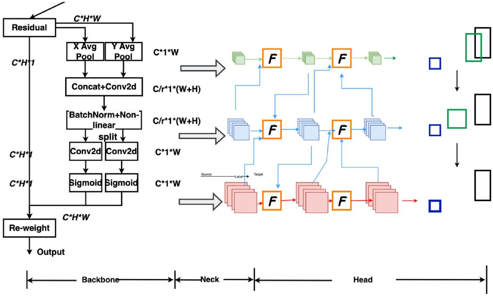 إن دمج آلية الانتباه التناسبي يعزز تركيز الشبكة على الهدف المراد اكتشافه ويحسن نتائج الكشف. عند دمجه مع الهيكل الموضح في الشكل 7b أدناه، فإن المفهوم الرئيسي للانتباه التناسبي هو كما يلي: يتم تجميع الميزات المدخلة بشكل منفصل في اتجاه h واتجاه w، مما يؤدي إلى