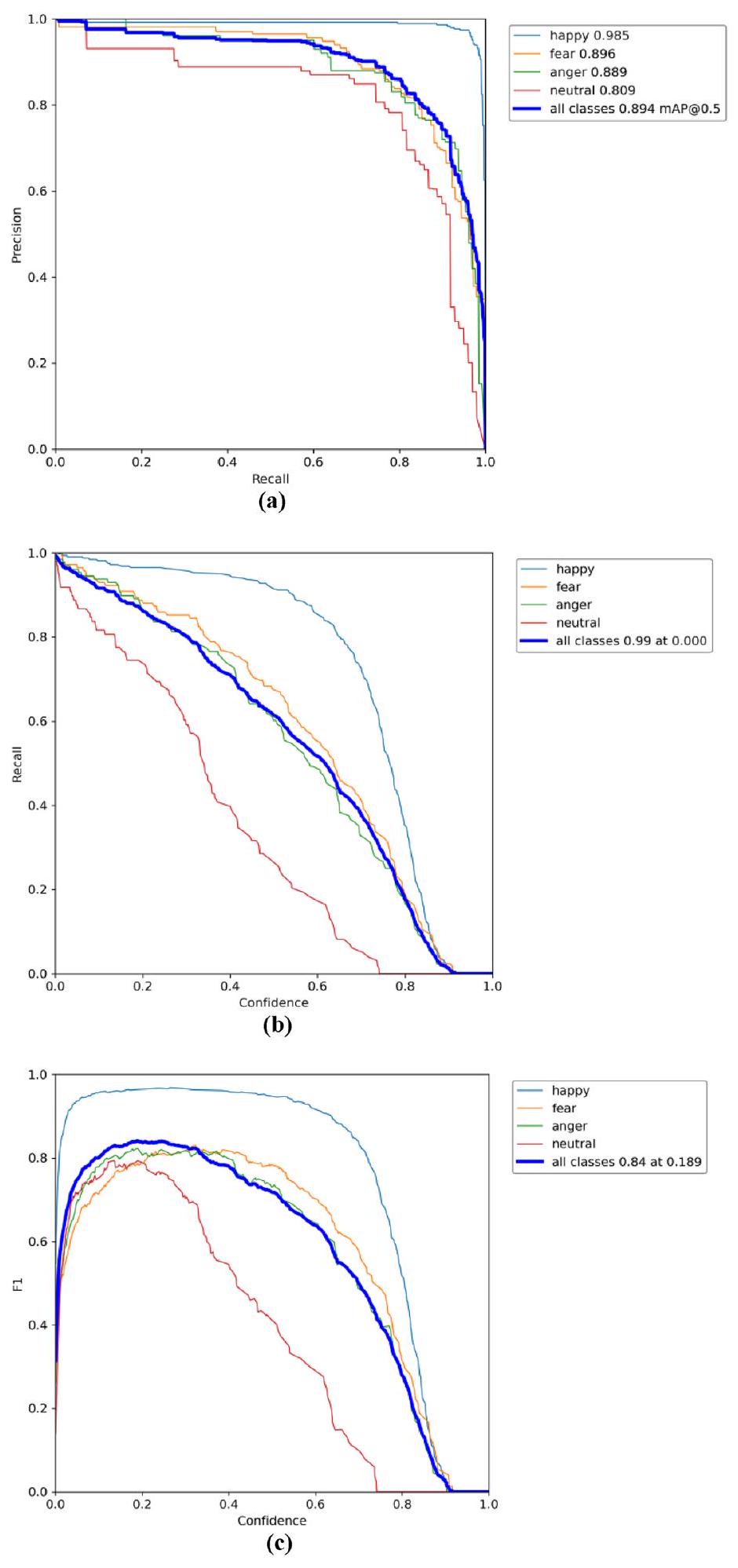 , it struggled profoundly with “anger” expressions, failing to detect them entirely. As depicted in Fig. 13c, the YOLOv8 model excels in recognizing the “happy” facial expression, underscoring its outstanding performance in identifying joyful facial cues. However, the confidence levels for “fear” (0.759) and “anger” (0.709) are relatively lower, indicating a potential need for further optimization to enhance the model’s sensitivity to these specific expressions. Meanwhile, the performance in detecting the “neutral” expression is the least satisfactory (0.495). This disparity may reflect challenges that the model encounters when dealing with certain facial expressions, warranting closer attention and targeted improvements.
