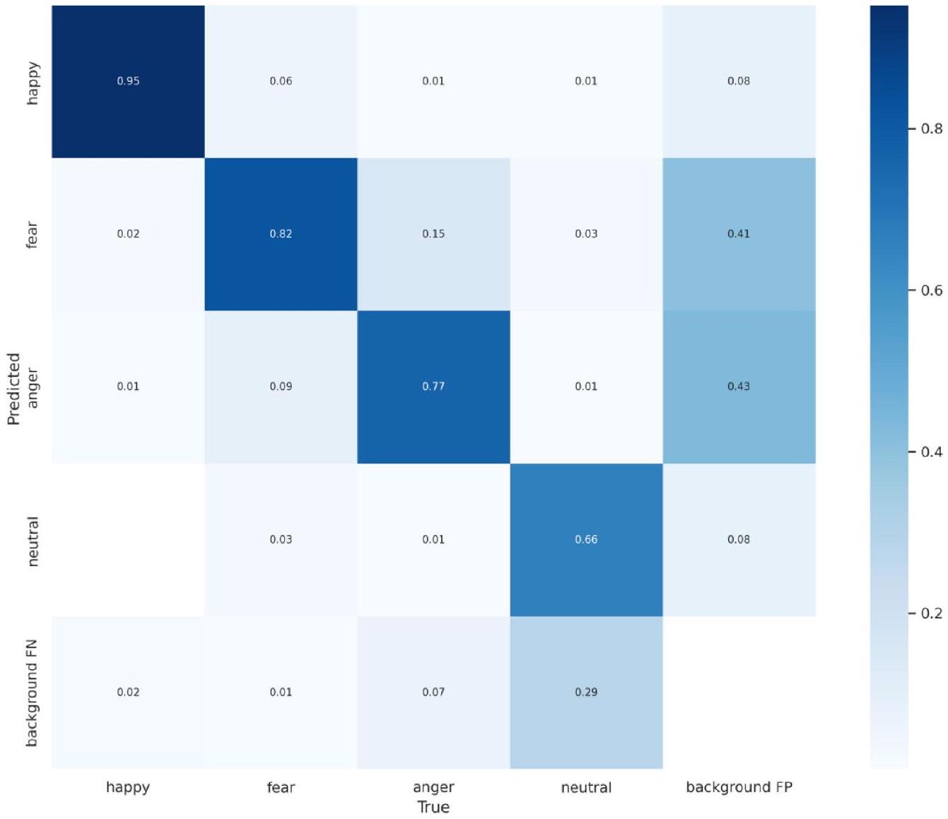 Furthermore, a notable aspect arises in the identification of the “neutral” expression. This category, inherently subtle by nature, poses a challenge, with a significant percentage being overlooked and classified as background. This might point towards the model’s sensitivity to subtle cues or the need for richer training data for this particular class. Another interesting observation is the occasional misclassification of what is essentially background noise as distinct emotional states. This points towards the potential for refining the model’s noise filtering capabilities.