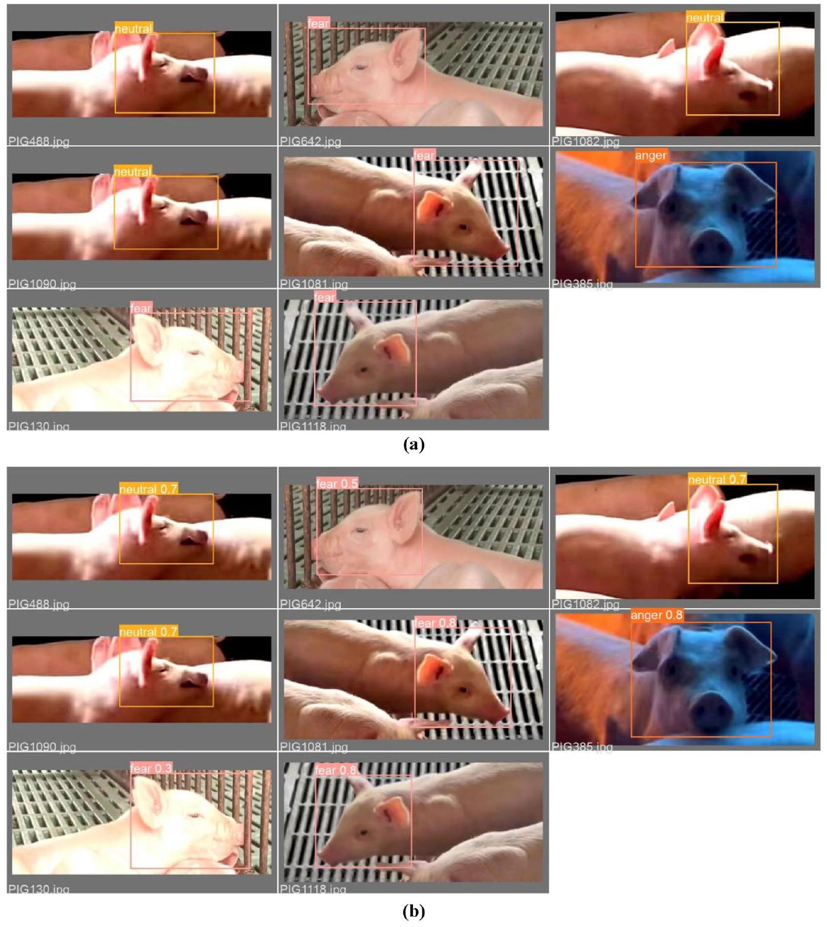 Figure 10 elucidates the test outcomes of the CReToNeXt-YOLOv5 model, juxtaposing validation batch labels (depicted in part (a)) against their corresponding predictions (highlighted in part (b)). At a glance, one can discern the model’s nuanced proficiency in capturing the spectrum of pig facial expressions, with a commendable degree of accuracy in identifying emotions such as ‘neutral’, ‘fear’, ‘anger’, and particularly ‘happy’. Delving deeper into the insights offered by this visual representation, the model’s prowess is particularly underscored in its ability to accurately decode ‘happy’ expressions, reflecting a high degree of precision in the range of